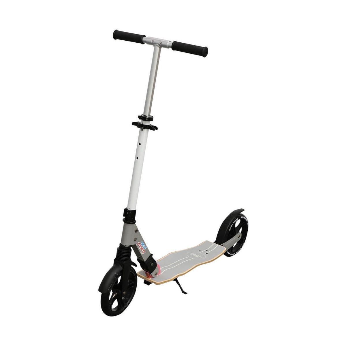NSP Scooter in schwarz mit einer Federung vorne und hinten. Das ergonomisch geformte Deck ist aus 8-lagigem Holz. Die Trittfläche hat die Maße von ca. 37x14 cm und die Räder haben die Maße von ca. 200x37 mm. ABEC 7 Kugellager. Mit Ständer. Höhenverstellbare Lenkerstange von ca. 75 cm bis 100 cm. Maximale Belastbarkeit von ca. 100 kg. Für Kinder ab 5 Jahren..