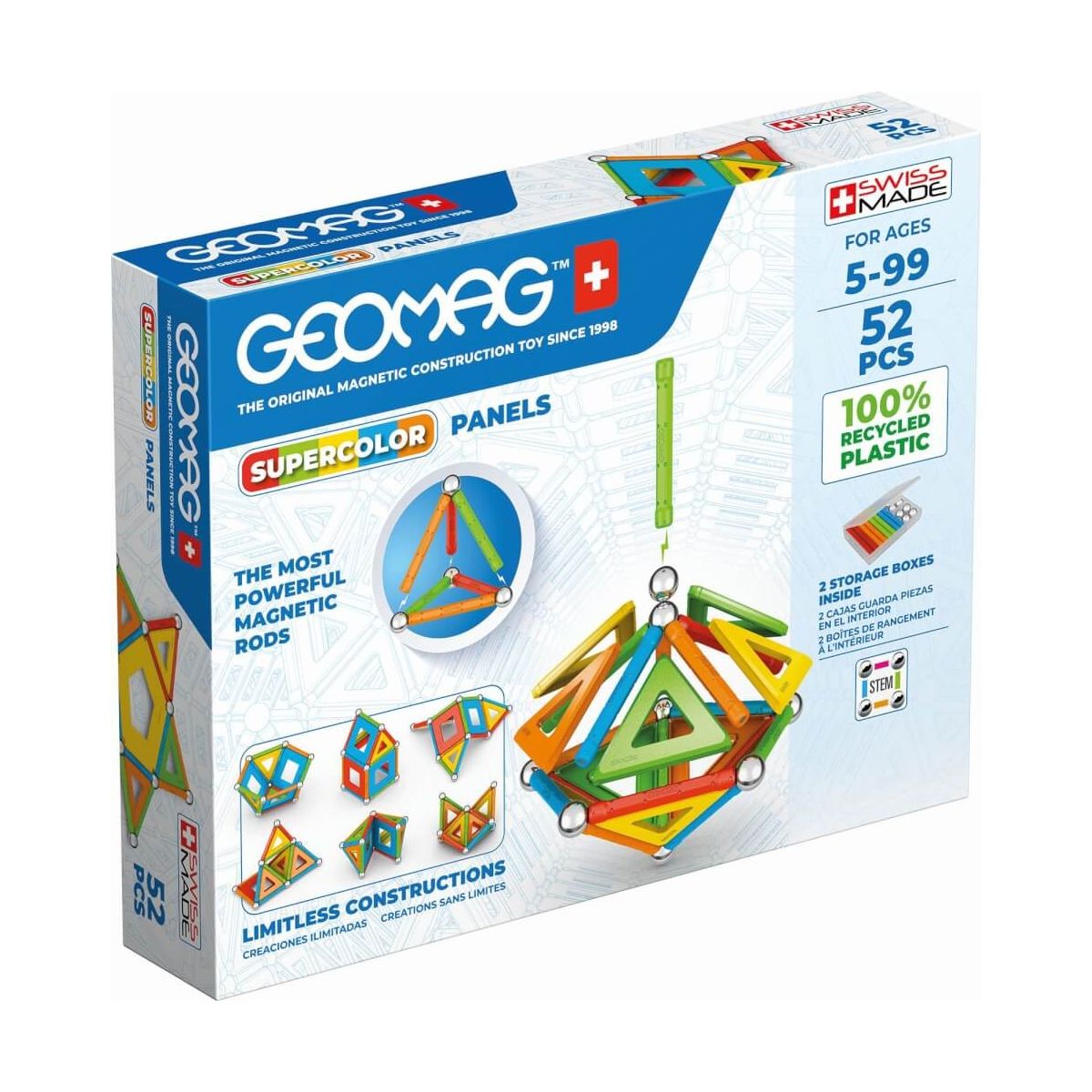 Das 52-teilige Supercolor-Set besteht aus 16 Kugeln, 16 Magnetstäben und 10 dreieckigen, 8 quadratischen und 2 fünfeckigen Tafeln. Die Stäbe sind durch die an beiden Enden angebrachten Magnete mit den Kugeln verbunden. Die auf den Stäben sichtbare Angabe der Polarität ermöglicht es Ihnen auch, das gesamte Potenzial des Magnetismus besser zu verstehen und schnellere Konstruktionen an der Grenze der physikalischen Gesetze zu erstellen. Die Geomag Supercolor-Reihe ist eine völlig neue Farbvariante der klassischen Geomag-Reihe: warme und kalte Grundfarben. Die farbigen Grundplatten machen die Strukturen stabiler. EXPLORE YOUR IMAGINATION: Die magnetischen Bausätze von Geomag sind der perfekte Weg, um Ihre Kreativität auszudrücken. Es gibt praktisch keine Grenzen für die Kreationen, die Sie machen können. Alles, was Sie brauchen, ist ein Bausatz und ein aktiver Geist. Magnetische Spielzeuge sind eine wunderbare Möglichkeit, spielerisch die Wissenschaft zu erforschen. Geomag öffnet die Tür für alle Kinder, um Wissenschaft, Kreativität und Technik zu erkunden, bevor sie in der Schule damit in Berührung kommen. GEOMAG INNOVATION: Unsere Produkte helfen Kindern aller Altersgruppen, ihren Verstand, ihre Vorstellungskraft und ihre Neugier durch die Wissenschaft der magnetischen Konstruktion zu entwickeln und zu trainieren. Geomag ist das bekannteste magnetische Konstruktionsspiel der Welt, bestehend aus magnetisierten Stäben und Metallkugeln Die Produkte von Geomag fallen in die Kategorie STEM (Akronym für Science, Technology, Engineering and Mathematics), was auf einen interdisziplinären Ansatz beim Lernen hinweist..