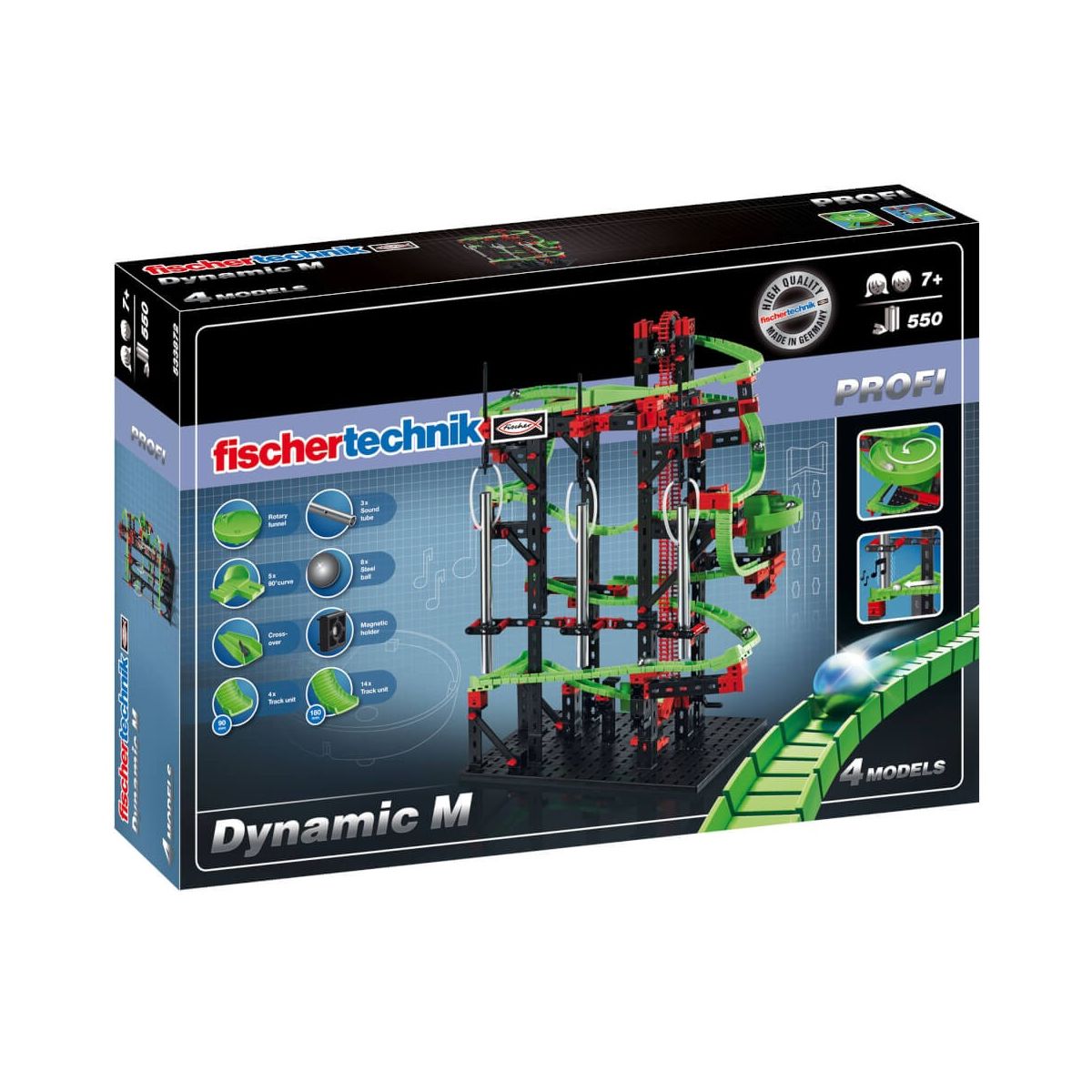Neue Action- und Klangbauteile eröffnen viele Möglichkeiten und noch spannendere Streckenführungen. Auf ihrem rasanten Weg nach unten lassen die Stahlkugeln die neuen Klangrohre zu melodischen Tönen erklingen. Über den Kreiseltrichter gelangen die Kugeln auf völlig neue Art und Weise auf die nächste Schiene. Die Kugeln schießen und schanzen im Parcours zudem durch enge 90°- Kurven und eine Wechselweiche. Unten angekommen, werden die Kugeln durch den manuell betriebenen Kettenaufzug wieder nach oben befördert. Mit dem neuen Baukasten Dynamic M können vier spannende Kugelbahnen gebaut werden. Inkl. Kreiseltrichter, 3x Klangrohr, Wechselweiche, 5x 90°-Kurve, Magnethalter, 8x Kugel, 4x Flexschiene 90, 14x Flexschiene 180..