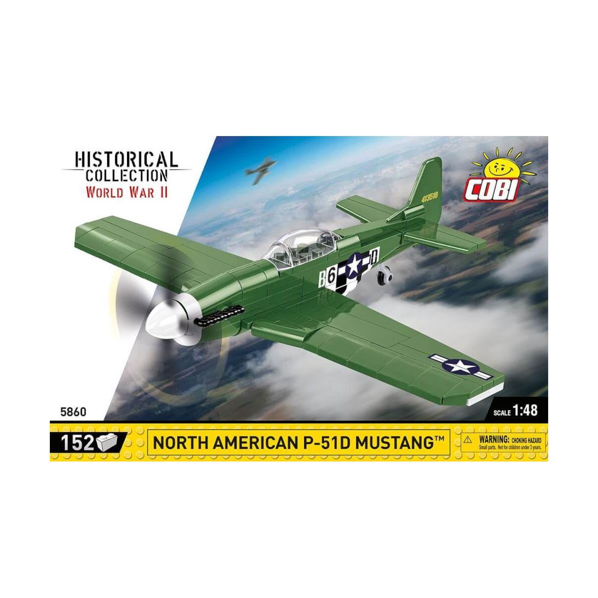 COBI-5860, NORDAMERIKANISCHER P-51D Mustang™, Historical Collection – WW II, 150 Elemente, Altersgruppe: 6+, Maßstab 1:48. Die wahre Legende der Lüfte, das amerikanische Jagdflugzeug Mustang P-51D, wurde von uns aus 150 COBI-Bausteinen nachgebildet. Wir haben uns für einen völlig neuen Maßstab von 1:48 für Kampfflugzeuge aus dem Zweiten Weltkrieg entschieden. Jetzt können Sie ganz einfach einen Schutz für Ihre riesigen COBI-Bomber bauen! Das Set enthält ausschließlich hochwertige Drucke mit Bezug zur historischen Bemalung des Flugzeugs. Der lizenzierte Mustang aus COBI-Klemmbausteinen ist ein tolles Kompaktmodell, das unter Luftfahrt- und Militärtechnik-Enthusiasten so manche Sammlung eröffnen wird! Es ist auch ein perfektes Modell für einen guten Start in Ihr Abenteuer mit polnischen COBI-Bausteinen! Die North American P-51 Mustang ist ein amerikanisches einmotoriges Jagdflugzeug im Zweiten Weltkrieg. Es wurde in Werken von North American Aviation in den USA hergestellt. Erfolgreich eingesetzt von der US Air Force und ihren Verbündeten im Zweiten Weltkrieg und im Koreakrieg. Das sehr erfolgreiche Design von 1940 führte dazu, dass das Flugzeug bis 1986 kontinuierlich weiterentwickelt wurde! In 46 Jahren wurden etwa 15.000 bis 16.000 Exemplare hergestellt. Mustangs. Derzeit befinden sich viele dieser Maschinen in Privatbesitz. Bis heute werden Mustangs eifrig bei Demonstrationsflügen und Sportwettkämpfen eingesetzt.150 hochwertige Elemente, hergestellt in der EU von einem Unternehmen mit über 20-jähriger Tradition, die Sicherheitsstandards für Kinderprodukte erfüllen, voll kompatibel mit Klemm-Bausteinen anderer Marken, Blöcke mit Aufdrucken verformen sich nicht und verblassen nicht beim Spielen oder unter Temperatureinfluss, klare und intuitive Anweisungen basierend auf Zeichnungen und Symbolen, Flugzeug im Maßstab 1:48Modellabmessungen (L x B x H): 20 cm (7,9 Zoll) x 23 cm (9 Zoll) x 9 cm (3,5 Zoll).