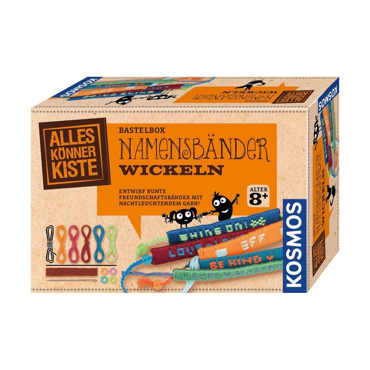 Jetzt wird gewickelt! Mit dieser AllesKönnerKiste zaubern Kinder ab 8 Jahren lustige Botschaften, Muster und die Namen ihrer Freunde auf bunte Armbänder. Die Anleitung erklärt ausführlich die besondere Wickeltechnik und liefert viele Beispiele für das individuelle Accessoire. Dafür die gewünschten Baumwollgarne und Perlen in den Lieblingsfarben auswählen und losbasteln. Bei diesem DIY-Projekt sind der Kreativität keine Grenzen gesetzt! Besonders cool: auch neon- und nachtleuchtende Garne sind in diesem Bastelset enthalten und machen dein Kunstwerk zum echten Hingucker. Jetzt heißt es: An die Wolle, fertig, los!.