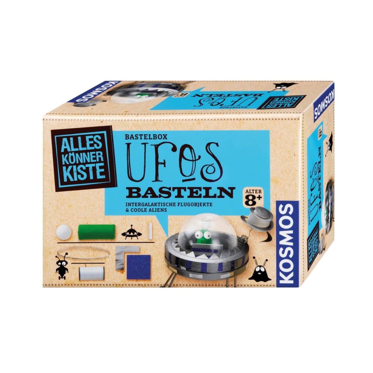 Aus unterschiedlichen Materialien intergalaktische Flugobjekte und coole Aliens basteln! Mit Metallic- und Glitzerfolie, Silberkarton, Kunststoffkuppel und Draht verwandelt sich eine einfache Schachtel im Handumdrehen in ein fantastisches Spielobjekt. Jetzt nur noch aus Knetmasse die Besatzung für die Weltraumfahrzeuge formen und schon kann der Spielspaß beginnen. Inhalt: silberfarbener Karton 17 x 11 cm, silberne Selbstklebefolie 17 x 11 cm, blaue selbstklebende Hologrammfolie 17 x 11 cm, 1 große Wattekugel, 2 kleine Wattekugeln, 4 Rundhölzer, 90 cm Draht, weißes Nähgarn, 11 g weiße Knete, 50 g grüne Knete, transparente UFO-Kuppel, runde Schachtel, Anleitung (16 S.) Zusätzlich wird benötigt: Bleistift, Schere, Seitenschneider, Bastelkleber, Lineal, Zirkel oder kreisrunden Gegenstand, Bastelfarbe, Pinsel und weitere, haushaltsübliche Materialien.