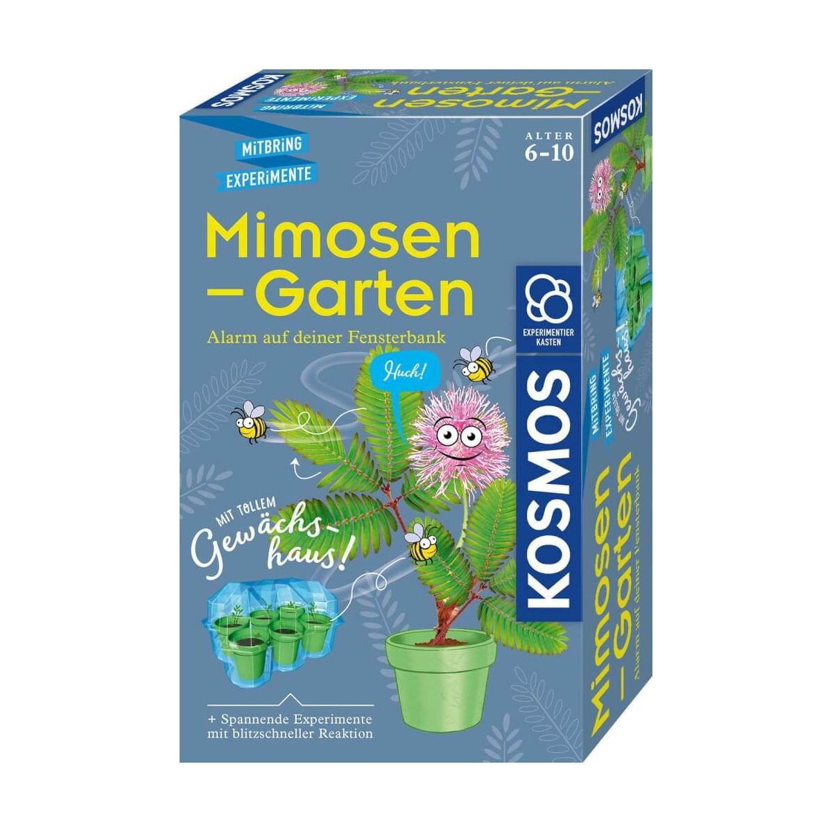 Huch! Eine Pflanze, die sich bei Berührung blitzschnell zusammenzieht! Was hinter dieser besonderen Reaktion der Mimose steckt, finden Kinder mit diesem kompletten Aufzuchtset heraus. Sobald die Mimosen-Samen in die Anzuchterde gegeben wurden, brauchen sie nur noch Licht und Wasser, und schon sind sie versorgt. Das Mini Gewächshaus passt auf jede Fensterbank und bietet ideale Bedingungen für das Pflegen und Beobachten der Keimlinge. Die anschauliche Anleitung beantwortet Fragen, die auch direkt an den Pflanzen getestet werden können: Was brauchen Mimosen, um zu wachsen? Warum reagieren sie so empfindlich auf Berührungen oder Temperaturen? Mit diesen und weiteren Versuchen ist das KOSMOS Experimentierset eine tolle Überraschung als kleines Geschenk oder Mitbringsel zum Kindergeburtstag..