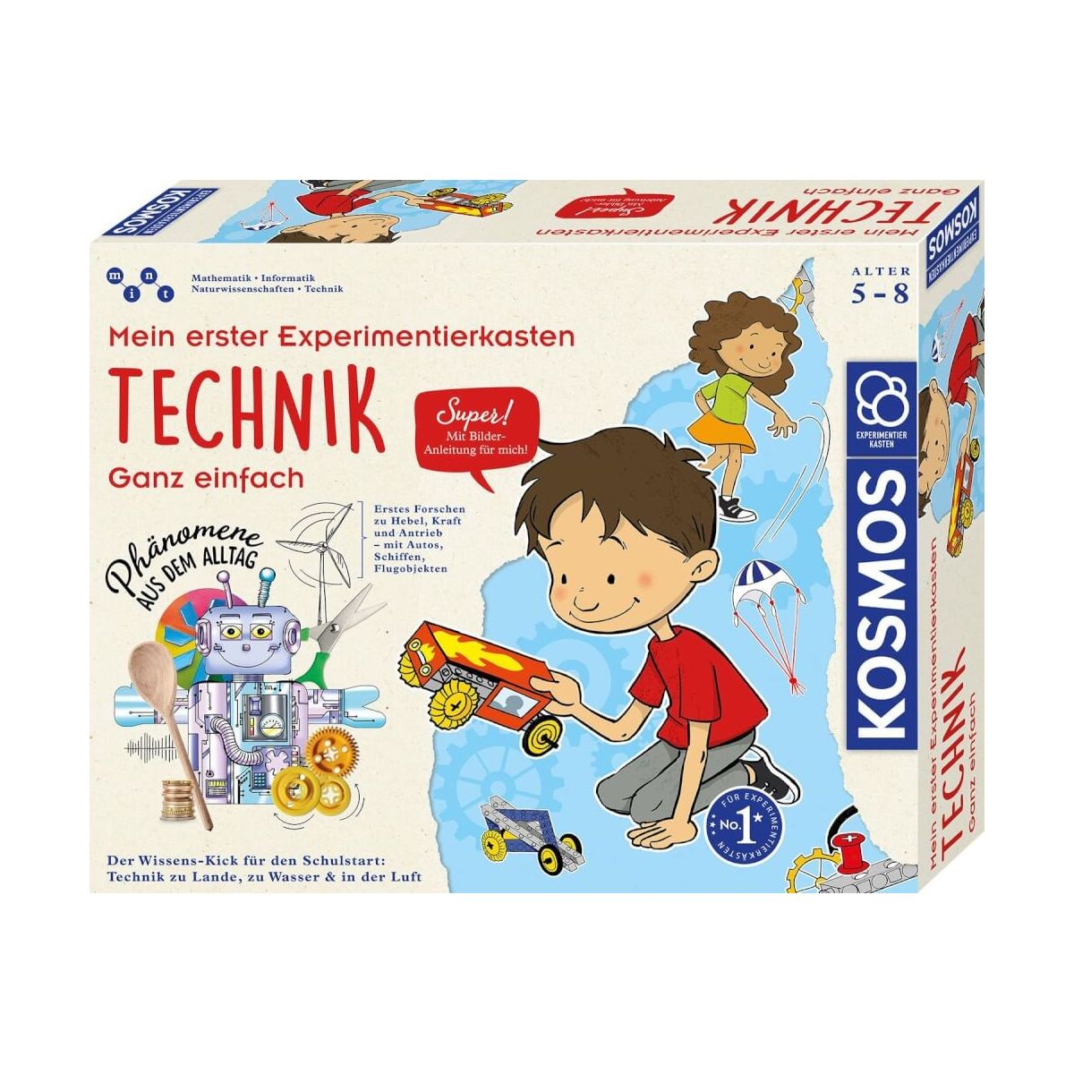Zu Land, zu Wasser und in der Luft ? hier wird Technik spielerisch erforscht. Ein kleines Auto flitzt durchs Zimmer und wird zum Schaufelradboot umgebaut. Ein Papierflieger gleitet elegant durch die Luft und der Fallschirm segelt zu Boden. Aber warum ist er so langsam? Das erklärt die Anleitung! Mit den 21 spannenden, aber einfachen Versuchen aus diesem KOSMOS Experimentierkasten entdecken Kinder, was hinter den Phänomenen aus ihrem Alltag steckt. Um das Forschen ohne Lesekenntnisse zu erleichtern, werden alle Handgriffe anschaulich in Bildern erklärt. So sind Erfolgserlebnisse garantiert! Das vielseitige Material aus Systembauteilen und bunten Ausschneidebögen fördert ganz nebenbei die Feinmotorik und Konzentration. Ein abwechslungsreicher Start in die Welt der Technik für Kinder von 5 bis 8 Jahren..