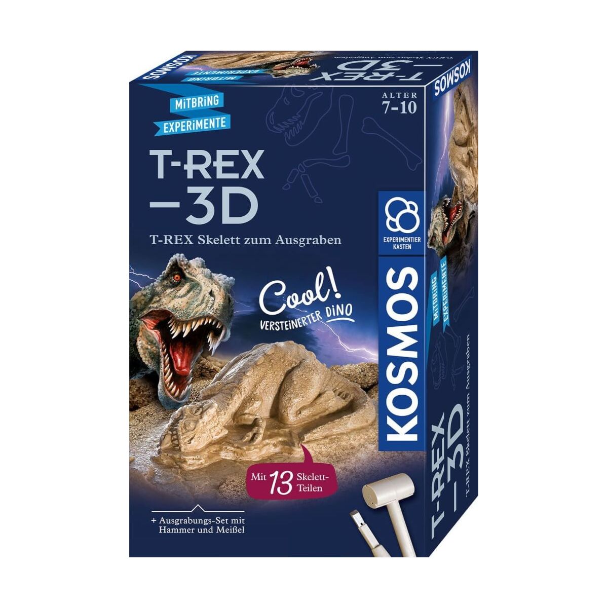 Auf ins Ausgrabungs-Abenteuer! Im Gestein verstreut liegen die Knochen eines Tyrannosauraus, die vorsichtig mit Hammer und Meißel freigelegt werden müssen. Echte Urzeit-Atmosphäre schafft die Gestaltung des Gips-Blocks, der die Form eines versteinerten 3D-T-Rex zeigt, als wäre er gerade erst gestorben! Sind die Knochen dieses Urzeit-Giganten erst einmal ausgegraben, bauen die Kinder zwischen 7 und 9 Jahren das Skelett zusammen und stellen es als tolle Deko in ihrem Zimmer auf. Wer genau hinsieht kann neben dem Skelett sogar das Modell eines Menschen erkennen, zum Größenvergleich! Mit dem KOSMOS Ausgrabungs-Set erleben Kinder Dinosaurier im eigenen Kinderzimmer!.