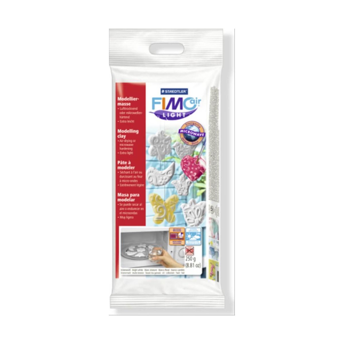 FIMOair Lufthärtende Modelliermasse. Weltweit einzigartig: federleichte Modelliermasse die nicht nur an der Luft, sondern in nur wenigen Minuten auch in der Mikrowelle gehärtet werden kann. Die patentierte Masse ist extra leicht und somit bestens geeignet für hängbare Modelle wie Mobiles. FIMOair ist ideal für Kunst, Freizeit und Hobby sowie für pädagogische Zwecke in Schulen, Kindergärten und ähnlichen Einrichtungen! Produkt-Eigenschaften: Trocknet an der Luft oder in nur 10 Minuten in der Mikrowelle, extra leicht, sofort gebrauchsfertig, Formstabil, Geruchsneutral, Angenehme Haptik (klebt nicht), Folienverpackung verhindert ein Austrocknen der Masse, Nachbearbeitbar: Kleben, Bemalen, Lackieren. 1 Block: 250g. Farbe: weiß. Ab 8 Jahren..