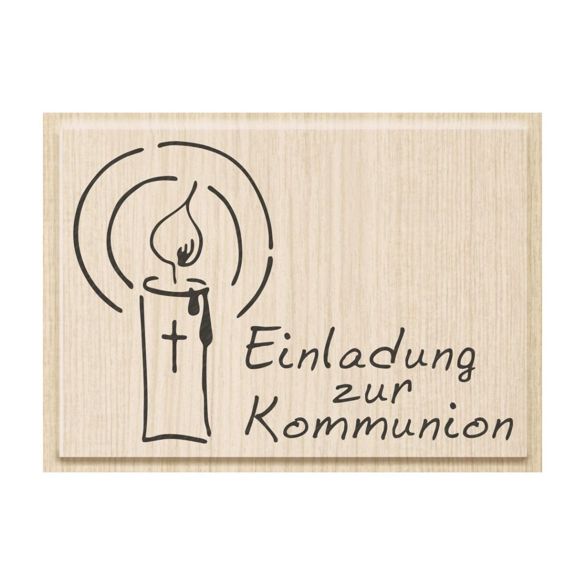 Einladung zur Kommunion · Holz, matt lackiert · spezielles Herstellungsverfahren des Kautschukpads für detailgenaue Stempelergebnisse · Motivgröße 8 x 5,5 cm · in PET-Box mit EurolochEinladung zur Kommunion · bois de h tre verni, mat · timbre en caoutchouc fabrique selon un procede special pour un resultat tr s pr ecis · taille du motif 8 x 5,5 cm · en boîte PET avec euro-perforationEinladung zur Kommunion · beuk, mat gelakt · speciaal productieproces van het rubber voor het stempelen van details · motief grote 8 x 5,5 cm · in PET box met eurosleufEinladung zur Kommunion · beech, matt varnish · rubber pads are produced using a special method for accurate stamping results · motif size 8 x 5.5 cm · in PET box with euro slot.