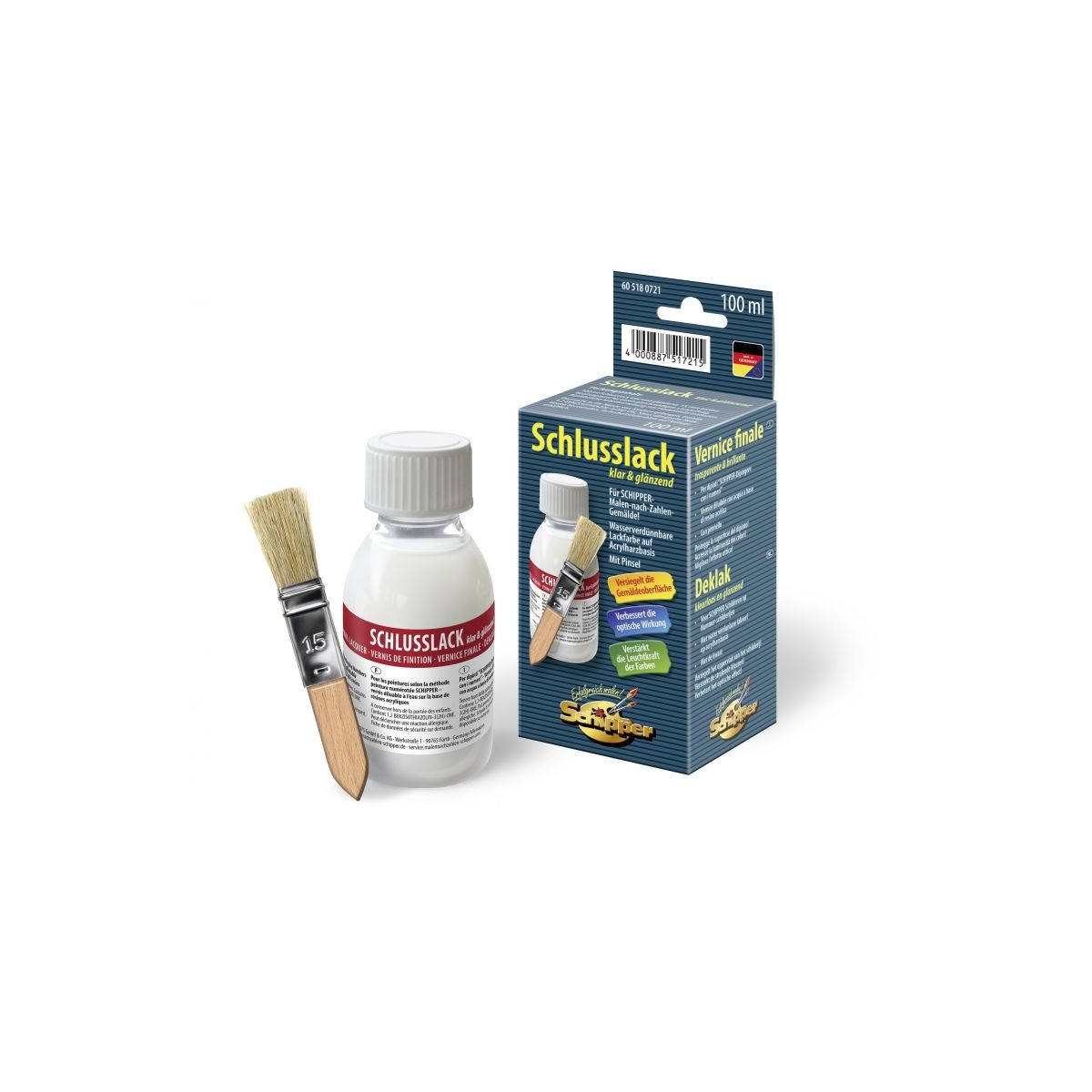 Schlusslack klar & glänzend'' für SCHIPPER Malen nach Zahlen Gemälde: Am Ende steht der große Moment, wenn das Bild fertig ist und der Maler voll Stolz sagen kann: Das habe ich gemalt!''. Das fertige Bild schmückt nun die Wohnung, der Hobbymaler ist stolz auf die eigene Leistung und erntet Anerkennung von Familie und Freunden. Eine solche Arbeit sollte für eine lange Zeit erhalten bleiben! Der Schlusslack klar & glänzend'' von SCHIPPER Arts & Crafts ist eine wasserverdünnbare Lackfarbe auf Acrylharzbasis. Er versiegelt die Oberfläche des Gemäldes, verstärkt die Leuchtkraft der Farbe und verbessert die optische Gesamtwirkung. 100ml Fläschchen, ausführliche Anleitung und breiter Pinsel für gleichmäßigen Auftrag.