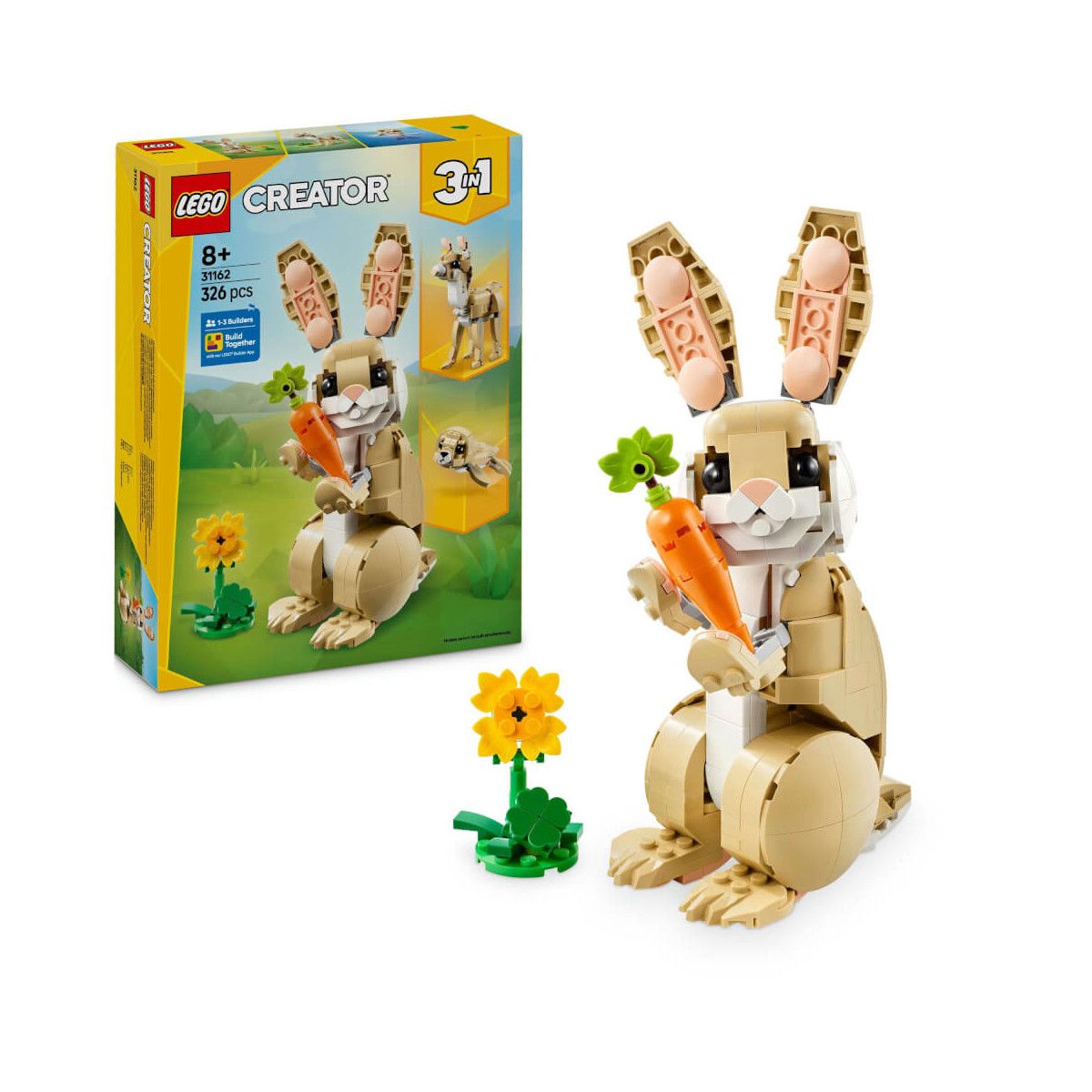 Schick Mädchen und Jungen ab 8 Jahren, die Tiere lieben, mit dem LEGO Creator Häschen (31162) aus diesem 3-in-1 Bauset in lustige Abenteuer. Das tierische Spielset beinhaltet ein Spielzeug Häschen, das Kopf, Ohren, Vorderläufe und Hinterläufe bewegen kann. Die Figur kann auf 2 oder 4 Beinen stehen. Zum Bauspielzeug gehören auch eine Sonnenblume und eine Karotte. Mädchen und Jungen können 3 verschiedene Tiere mit den Steinen aus diesem LEGO Bauset bauen: ein bewegliches Häschen mit Sonnenblume und Karotte, eine bewegliche Lama Figur mit einem grünen Grasbüschel und eine Robbe mit einer kleinen Eisscholle und einem Fisch. Alle 3 Kulissen lassen Kinder fantasievoll spielen. Die Modelle zum Spielen und Ausstellen sind ein tolles Geschenk. LEGO Creator 3-in-1 Sets bieten jeweils 3 Bauoptionen und wecken die Fantasie der Kinder, die die Modelle mit großer Begeisterung bauen und immer wieder umbauen. Und die LEGO Builder App bietet euch ein tolles gemeinsames Bauerlebnis. Wichtiger Hinweis: Die Modelle können nicht gleichzeitig gebaut werden. Das baubare Häschen ist 19 cm groß. Enthält 326 Teile..