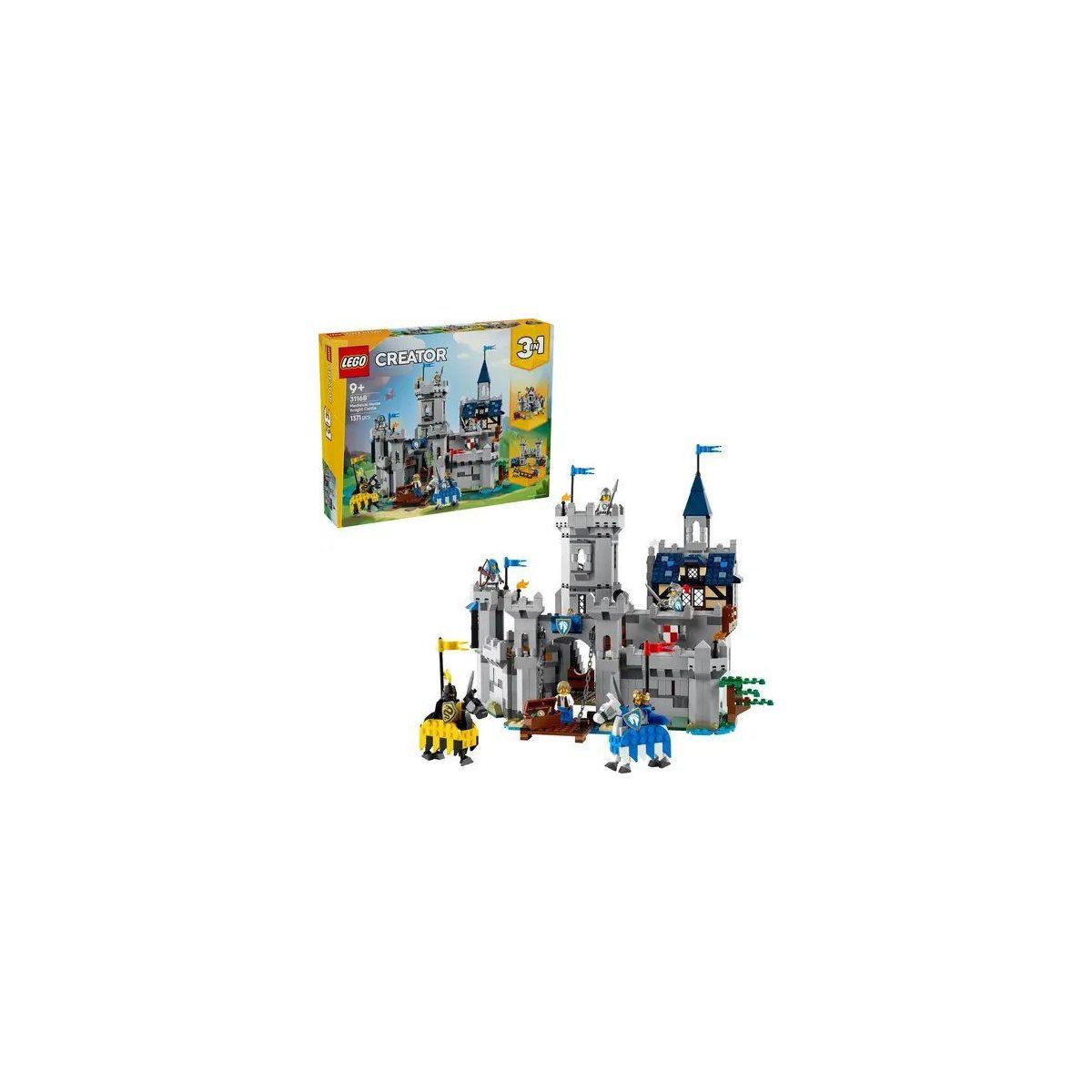 Mit der LEGO Creator Ritterburg im Mittelalter (31168) tauchen Kinder ab 9 Jahren in eine aufregende Welt voller Ritter, Burgen und Heldengeschichten ein. Dieses kreative Konstruktionsspielzeug lässt sich in drei beeindruckende Modelle verwandeln: eine große LEGO Ritterburg, einen Turnierplatz mit kleiner Burg oder eine mittelalterliche Stadt mit Windmühle. Die detailreiche LEGO Ritterburg begeistert mit zahlreichen Funktionen: Die Rückwand lässt sich aufklappen, und es gibt eine bewegliche Zugbrücke, einen großen Saal, Stall, Schmiede, eine geheime Schatztruhe, das Schlafgemach des Königs, eine Schreibstube und zwei Turmterrassen – für spannende Rollenspiele im Stil des LEGO Mittelalters. Zum Set gehören sechs detailreich gestaltete Ritterfiguren: ein Ritterkönig, ein Ritterturniersieger, ein Bogenschütze, ein Speerträger, ein Schmied und ein Schlangenritter. Zwei bewegliche Pferde erweitern die Spielmöglichkeiten. So entstehen immer neue Geschichten rund um das LEGO Schloss und seine Bewohner. LEGO Creator 3-in-1-Sets stehen für Abwechslung und jede Menge Spielspaß. Kinder können ihre Modelle immer wieder umbauen und eigene mittelalterliche Welten erschaffen. Ob Ritterfiguren, Burgen oder Dörfer, mit diesem LEGO Set wird jedes Spiel zum Abenteuer. Ein spannendes Geschenk für Kinder, die sich für Ritter, Bauwerke und kreative Bauprojekte begeistern – geeignet für Jungen und Mädchen gleichermaßen. Die Ritterburg aus diesem LEGO 3-in-1-Bauset ist 31 cm hoch, 36 cm breit und 30 cm tief Enthält 1.371 Teile..