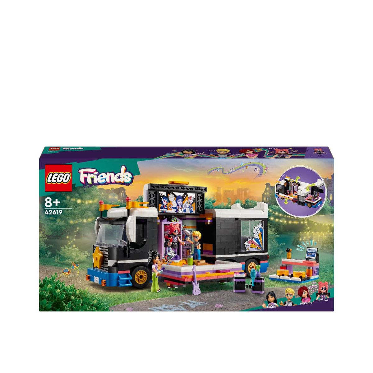 Mit dem LEGO Friends Popstar-Tourbus (42619) können Mädchen und Jungen ab 8 Jahren besonders fantasievoll spielen. Das Musikspielzeug beinhaltet ein baubares LKW-Spielzeug, einen Backstage-Bereich mit Zubehör sowie 4 LEGO Friends Figuren für spannende Rollenspiele. Mit disem Kinderspielzeug kann dein Kind darstellen, wie sich die schüchterne Paisley in den Superstar Ley-La verwandelt. Dein Kind muss nur den Spiegel drehen, um sie einen furiosen Auftritt hinlegen zu lassen. Kinder können sich viele weitere Geschichten ausdenken und Olly beispielsweise ein Bühnenoutfit für die Sängerin schneidern lassen. Vielleicht besucht aber auch Liann ihren Lieblingsstar. Front, Seite und Heck des LEGO Busses kann man aufklappen, um Zugang zum Backstage-Bereich zu erhalten. Dort findest du eine Aufnahme-Ecke, ein Keyboard, eine Gitarre, Betten und eine Toilette. Außerdem beinhaltet dieser Bausatz für Kinder eine Autogrammkarte, Schulterpolster, Schuhe, Makeup und ein Handy. LEGO Friends Sets vereinen veilseitige Charaktere mit spannenden Handlungen und fördern somit die sozial-emotionale Entwicklung deines Kindes. Dieser LEGO Spielzeug-Bus ist ein tolles Musik-Geschenk für junge Musikliebhaber und eignet sich vor allem als Geburtstagsgeschenk für Kinder. Der Bus ist 12 cm hoch, 28 cm lang und 11 cm breit. Enthält 845 Teile..