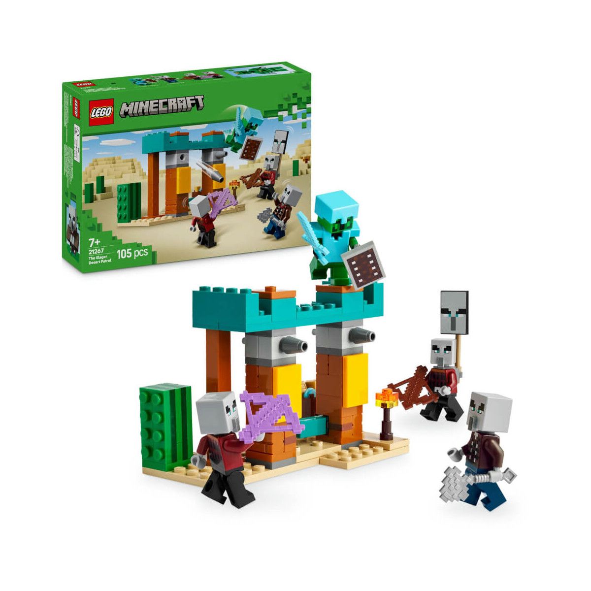 Dieses kleine LEGO Set für Kinder ab 7 Jahren bietet Minecraft Spielern jede Menge Actionspaß. Die Illager-Wüstenpatrouille (21267) ist zwar ein kleines Spielzeug, doch 4 LEGO Minecraft Figuren, coole Funktionen und authentisches Zubehör versprechen reichlich Abenteuer und Action. In einem Minecraft Wüstenaußenposten schlüpfen Kinder in die Rolle des Kaktusritters mit Diamantrüstung, Diamantschwert und Diamantschild. Wenn die 3 Illager-Figuren versuchen, Schätze zu stibitzen, liegt es an deinem Kind den Außenposten zu verteidigen. Das Bauset beinhaltet Raketen, die Kinder mit den Fingern losschnippen können, diverse Ausrüstung und ein Fass voller Schätze. Zusätzlichen digitalen Bauspaß bietet die LEGO Builder App. In der App können Kinder 3D-Modellansichten des LEGO Minecraft Bauspielzeugs auf ihrem Smartphone vergrößern und drehen. Dieses LEGO Minecraft Spielset mit Minifiguren ist ein tolles Geschenk für Jungen, Mädchen und Fans des beliebten Videospiels. Das fertige Modell aus diesem Spielset ist 8 cm hoch, 11 cm breit und 6 cm tief. Enthält 105 Teile..