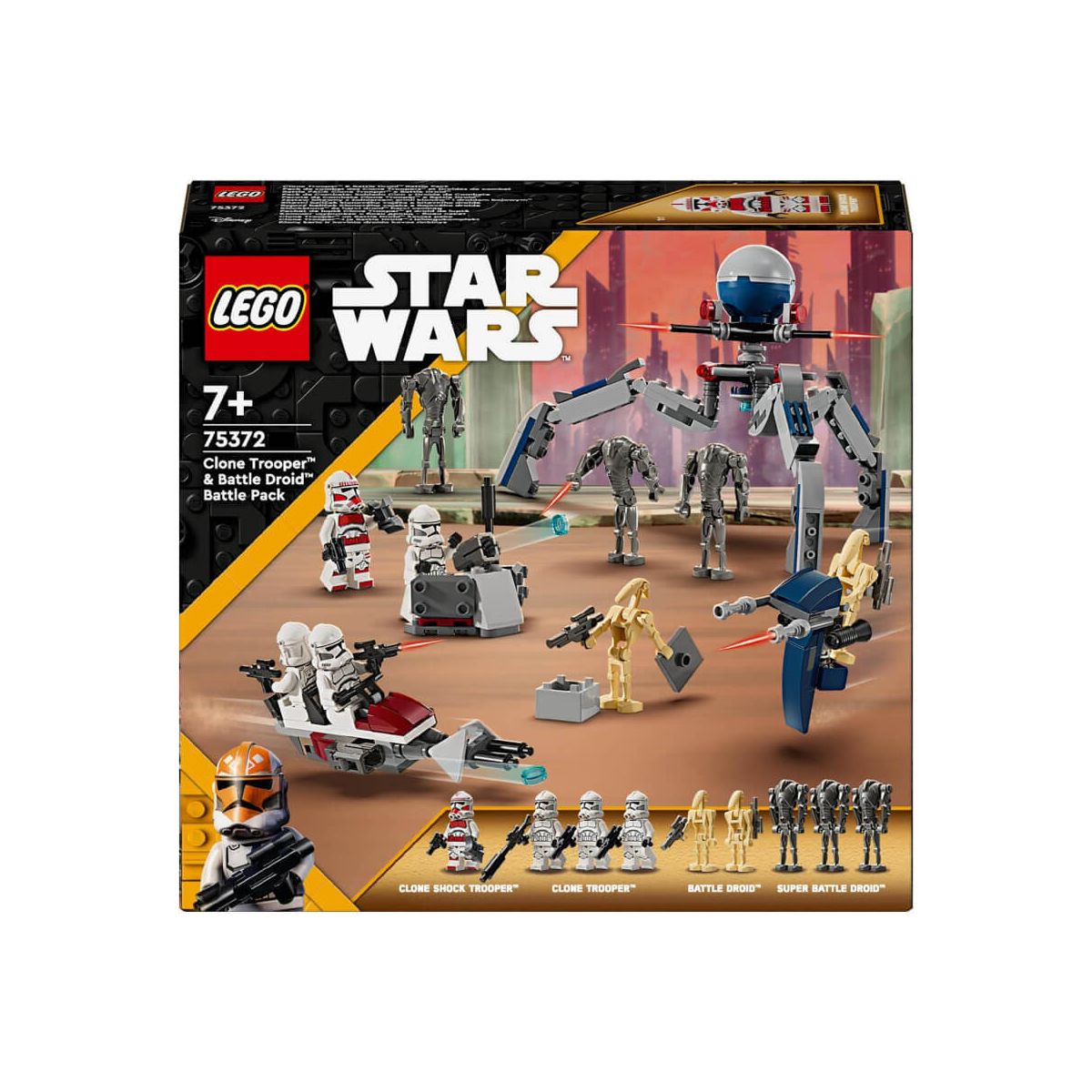 Lass Kinder ab 7 Jahren Actionszenen aus Star Wars: The Clone Wars mit dem LEGO Star Wars Clone Trooper Battle Droid Battle Pack (75372) nachstellen. Es liegt bei deinem Kind, wer diese Schlacht gewinnt! Dieses Action-Spielzeug beinhaltet 4 LEGO Star Wars Minifiguren und 5 LEGO Droiden – einen Clone Shock Trooper, 3 Clone Troopers, 3 Superkampfdroiden und 2 Kampfdroiden mit legendären Waffen für ein spannendes Spielerlebnis. Außerdem gibt es ein Star Wars Speeder Bike mit Shooter für 2 Clone Troopers sowie einen baubaren STAP-Speeder für einen Kampfdroiden. Ein Tri-Droide mit 3 Shootern sowie ein Verteidigungsposten mit Shooter bieten noch weitere kreative Spielmöglichkeiten. In der LEGO Builder App findest du digitale Bauanleitungen sowie Vergrößerungs- und Drehfunktionen zum Betrachten der digitalen Modelle, die deinem Kind ein noch faszinierenderes Bauerlebnis bieten. Die Figuren und Modelle aus diesem eigenständigen beliebten Spielzeugen lassen sich auch wunderbar mit den anderen separat erhältlichen LEGO Star Wars Sets aus der umfangreichen LEGO Star Wars Produktreihe kombinieren. Dieses LEGO Star Wars Clone Trooper Spielzeug für Kinder wird Jungs und Mädchen, die actiongeladene Rollenspiele lieben, gefallen. Der Tri-Droide ist 12 cm hoch, 15 cm lang und 13 cm breit- Enthält 215 Teile..
