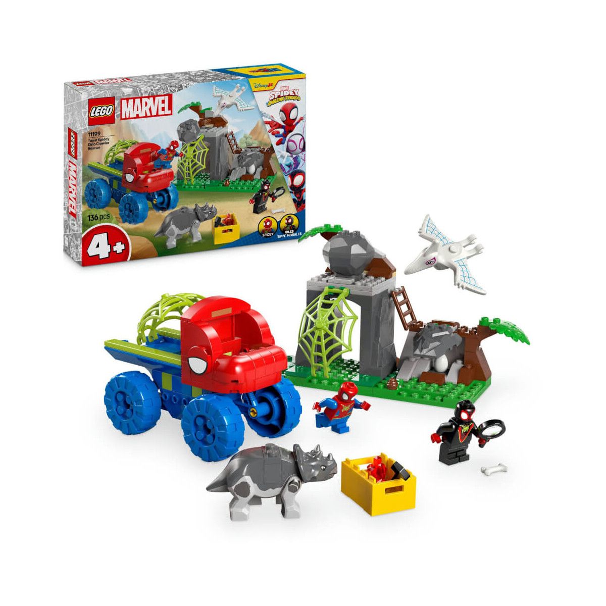 Überrasche Fans von Spidey und seine Super-Freunde mit dem Bauset Spideys Team auf Rettungsmission im Dino-Truck (11199). Dieses Superhelden Spielzeug für Kinder ab 4 Jahren beinhaltet einen Spielzeug Truck, Superhelden, Dinosaurier und coole Zubehörelemente, die Jungen und Mädchen zu fantasievollen Rollenspielen einladen. Beim Spielen entwickeln Vorschulkinder Selbstvertrauen und lernen, wie man kleine Probleme löst. Dieses LEGO Bau- und Spielset beinhaltet die Minifiguren Spidey and Miles „Spin Morales sowie 2 baubare Dinosaurier: Ghost-Spider in Gestalt eines Pterodaktylus und Rhino in Gestalt eines Triceratops. Auf der Heckladefläche des LEGO Dino-Trucks von Spideys Team ist ein großes Netz befestigt. Mit einem Auslöser kann man einen Felsen herunterkrachen lassen, ein Dino-Ei ist gut versteckt, und man kann ein Netz herunterfallen lassen, um den Schurken zu fangen. Eine intuitive Bauanleitung in Form einer Bildergeschichte liegt dem Bauspielzeug bei. Und in jedem Beutel befinden sich die Bausteine für jeweils ein Modell inklusive großem Starter-Bauelement, um Kinder rasch und mühelos bauen zu lassen. LEGO Sets für Vorschulkinder ab 4 Jahren bieten sich besonders an, um Eltern und Kinder miteinander großen Bauspaß erleben zu lassen. Der Dino-Truck ist 8 cm hoch, 10 cm lang und 6 cm breit. Enthält 136 Teile..