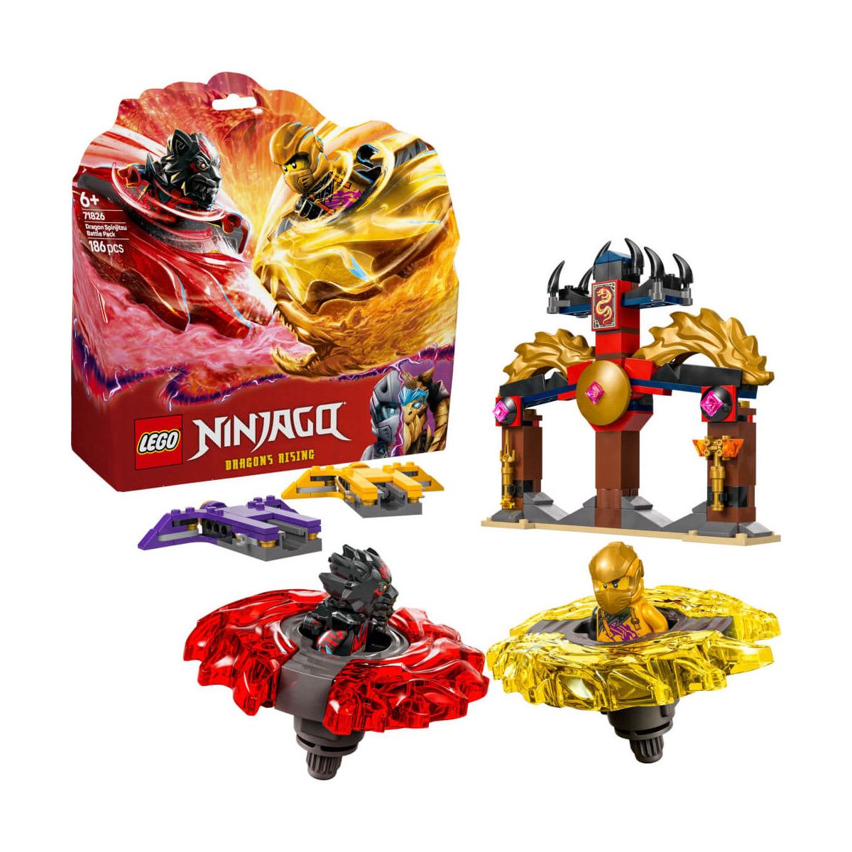 Das Drachen-Spinjitzu Battle Pack (71826) ist ein spannendes Action Spielzeug, das Jungen und Mädchen ab 6 Jahren die atemberaubenden Szenen aus der 3. Staffel der TV-Serie NINJAGO Aufstieg der Drachen nachstellen lässt. Dieses kleine LEGO Spielset beinhaltet eine Tempelarena, die beiden Minifiguren Arin und Ras sowie 2 Drachen-Spinjitzu-Spinner. Kinder können die Spinner in die Startkatapulte stecken und dann loswirbeln lassen, damit sie sich packende Duelle liefern. Mit diesem Bauspielzeug können Kinder sich auf spannende Abenteuer, Rollenspiele und Duelle zwischen Gut und Böse freuen. Sie müssen nur Arins gelben Spinner und Ras‘ roten Spinner loswirbeln lassen. An beiden Spielzeugen befinden sich Energie-Elemente, die bei einem Aufprall abplatzen können. Und die NINJAGO Figuren können ihre Spinner mit goldenen Elementen upgraden, wenn sie gegen die Arena prallen und diese zum Einsturz bringen. In dem breiten Angebot an LEGO NINJAGO Bausets und Spielzeugen finden Ninja-Fans Mechs, Drachen und Tempel für jede Menge Actionspaß. Jedes dieser Ninja-Spielsets kann auch mithilfe der LEGO Builder App gebaut werden, die dich und dein Kind auf ein ebenso einfaches wie intuitives Bauabenteuer mitnimmt. Die Tempelarena ist 14 cm hoch, 16 cm breit und 3 cm tief und kann zum Einsturz gebracht werden. Enthält 186 Teile..