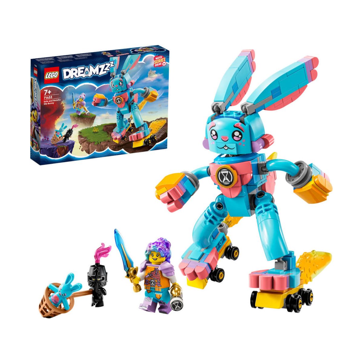 Izzie braucht Hilfe! Ihr liebstes Kuscheltier wurde von dem bösen Albgnom entführt und junge Träumer müssen ihr dabei helfen es zu retten. Kinder ab 7 Jahren können sich ihr anschließen und einen riesigen LEGO DREAMZzz Hasen bauen mit dem LEGO DREAMZzz Izzie und ihr Hase Bunchu (71453) Set. Die detailgetreue LEGO Minifigur von Izzie und Bunchus riesige Dream-Tierfigur lassen den Actionspaß aus der neuen LEGO TV-Serie zum Leben erwachen. Dieses LEGO DREAMZzz Set regt zum kreativen Spielen an, denn Izzie trägt eine Rüstung mit goldblauem Schwert und einer Sanduhr, während es für das LEGO Kaninchen-Spielzeug 2 Ausstattungsmöglichkeiten gibt: Bunchu kann entweder mit Rollschuhen und Handschuhen oder mit Bienenflügel und Bienenstachel ausgestattet werden, die Wahl liegt bei deinem Kind. Die Bauanleitung gibt Anweisungen aber lässt dein Kind schon während dem Bauen die Geschichte in Bildern verfolgen. Das kreative Spielzeug enthält außerdem zwei weitere Figuren – den Albgnom und den kleinen Bunchu, der von dem Albgnom gefangen wird. Das LEGO DREAMZzz Izzie und ihr Hase Bunchu Set ist ideal für Jungen und Mädchen ab 7 Jahren, die mit den LEGO DREAMZzz Charakteren spannende Abenteuer in der Traumwelt erleben möchten. Es ist ein tolles Geschenk für tierliebende und abenteuerlustige Kinder, denn sie werden besonders Spaß daran haben, Izzie zu helfen den kleinen Bunchu zu retten. Bunchu ist ohne seine Raketenrollschuhe 19 cm groß. Enthält 259 Teile..