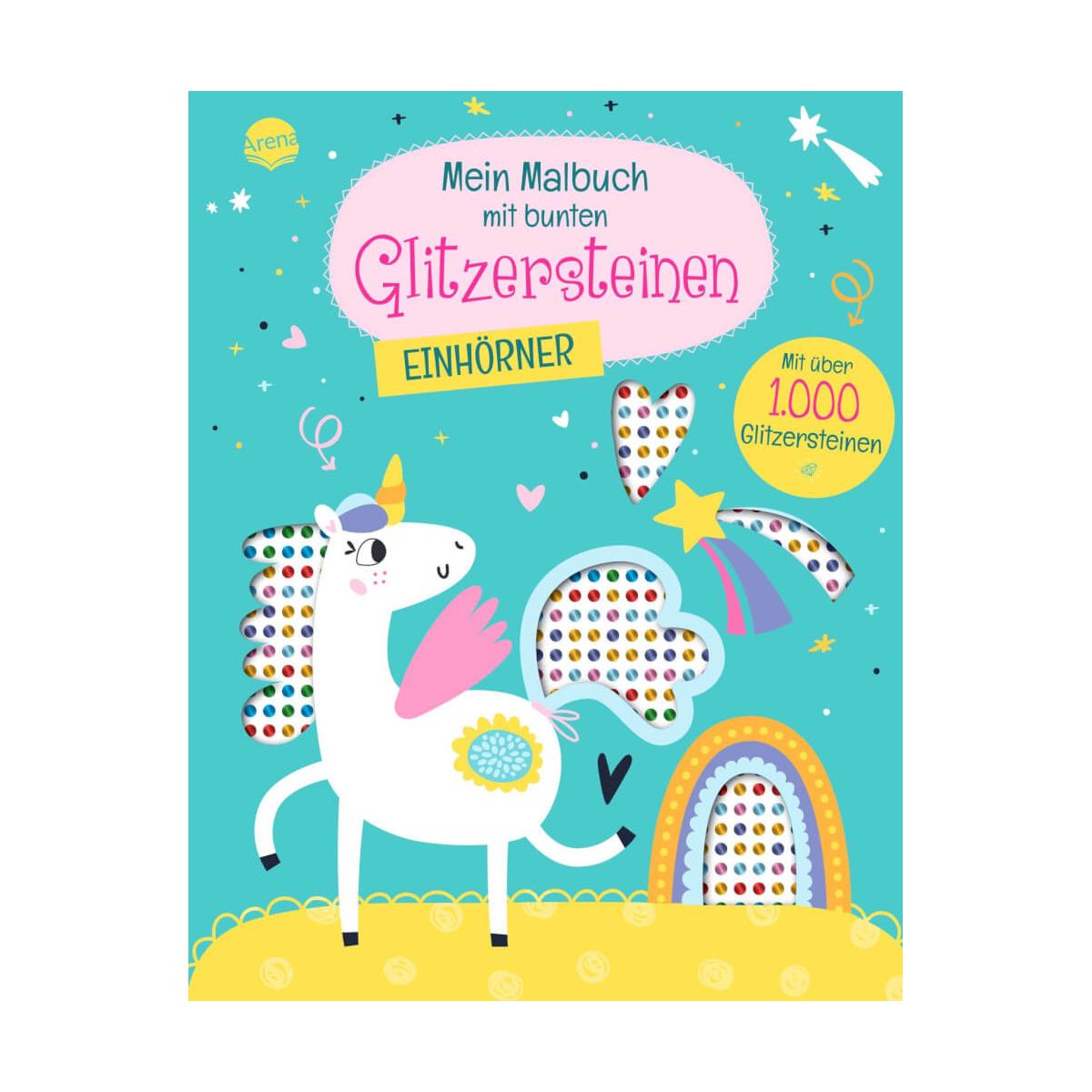 Einhorn-Malbuch mit über 1.000 Glitzersteinen Dieses Malbuch funkelt und glitzert! Zwölf wunderbar einhornige Bilder können zuerst ausgemalt und dann mit über 1.000 Glitzersteinen verziert und verschönert werden. Ob Regenbogen, Luftballons oder Einhorn-Mähne – alles kann ausgemalt und mit den bunt funkelnden Steinchen gestaltet werden. Zum Schluss können die glitzer-schönen Seiten ganz leicht an der Perforierung herausgetrennt und bestaunt, aufgehängt oder verschenkt werden. Fantastisch illustriert. Das lässt Einhorn-Herzen garantiert höherschlagen!.