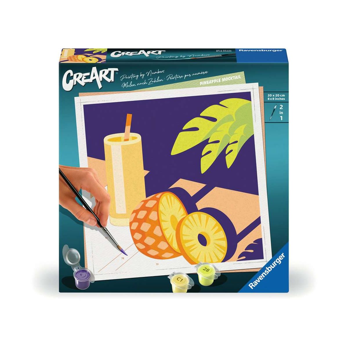 Coole Motive, leuchtende Farben und glänzender Lack für ein perfektes Finish. Das trendige Motiv Mocktail Ananas sorgt für großartigen Malspaß für Erwachsene ab 12 Jahren. Die Motivlinien sind bereits aufgedruckt und nummeriert und werden mit den fertig gemischten Acrylfarben ausgemalt. Das ist Malspaß mit Erfolgsgarantie für einen einzigartigen Wandschmuck. So einfach war malen noch nie!Mit CreArt - Malen nach Zahlen von Ravensburger den Weg zur inneren Ruhe und Entspannung finden. Einfach auspacken und los malen: jedes Malset enthält alles, was zum Malen benötigt wird und es ist kein Mischen der Farben notwendig. Das fertig gemalte Bild eignet sich als trendige Dekoration in jedem Zuhause. Das Ravensburger CreArt - Malen nach Zahlen Programm bietet eine große Motivauswahl für Kinder und Erwachsene..