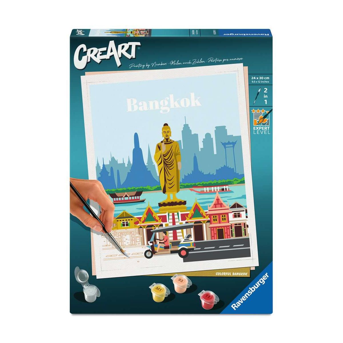 New York, Paris, Mailand und viele mehr! Entdecken Sie die schönsten Städte der Welt und holen Sie sich mit unseren Malen nach Zahlen-Sets ihren Zauber direkt zu sich nach Hause! Das trendige Motiv Farbenfrohes Bangkok bietet großartigen Malspaß für Erwachsene ab 12. Die Motivlinien sind bereits aufgedruckt und nummeriert und werden mit den fertig gemischten Acrylfarben ausgemalt. Das ist Malspaß mit Erfolgsgarantie für eine einzigartige Wanddekoration Ihrer Stadt. Malen war noch nie so einfach!Mit CreArt - Malen nach Zahlen von Ravensburger den Weg zur inneren Ruhe und Entspannung finden. Einfach auspacken und los malen: jedes Malset enthält alles, was zum Malen benötigt wird und es ist kein Mischen der Farben notwendig. Das fertig gemalte Bild eignet sich als trendige Dekoration in jedem Zuhause. Das Ravensburger CreArt - Malen nach Zahlen Programm bietet eine große Motivauswahl für Kinder und Erwachsene..