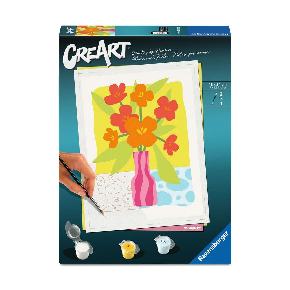 Coole Designs, leuchtende Farben und glänzender Lack für ein perfektes Finish. Das trendige Motiv Oleander bietet großartigen Malspaß für Erwachsene ab 12. Die Motivlinien sind bereits vorgedruckt und nummeriert und müssen mit den fertig gemischten Acrylfarben ausgemalt werden. Das ist Malspaß mit Erfolgsgarantie für eine einzigartige Wanddekoration. Malen war noch nie so einfach!Mit CreArt - Malen nach Zahlen von Ravensburger den Weg zur inneren Ruhe und Entspannung finden. Einfach auspacken und los malen: jedes Malset enthält alles, was zum Malen benötigt wird und es ist kein Mischen der Farben notwendig. Das fertig gemalte Bild eignet sich als trendige Dekoration in jedem Zuhause. Das Ravensburger CreArt - Malen nach Zahlen Programm bietet eine große Motivauswahl für Kinder und Erwachsene..