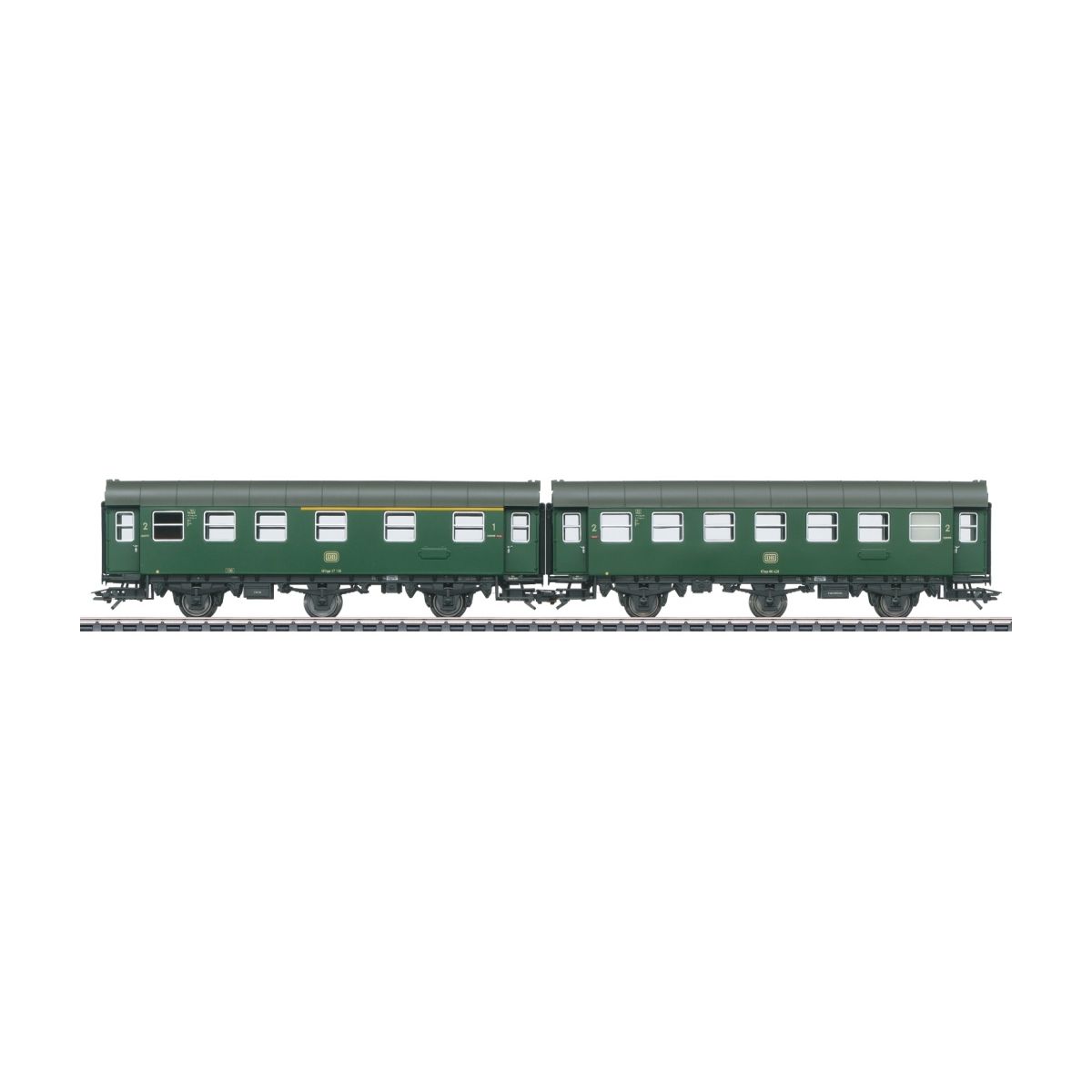 Vorbild: Umbauwagen 1./2. Klasse AB3yge und 2. Klasse B3yge mit je drei Radsätzen. Fest gekuppelter Doppelwagen. Chromoxidgrüne Farbgebung. Betriebszustand 1965.