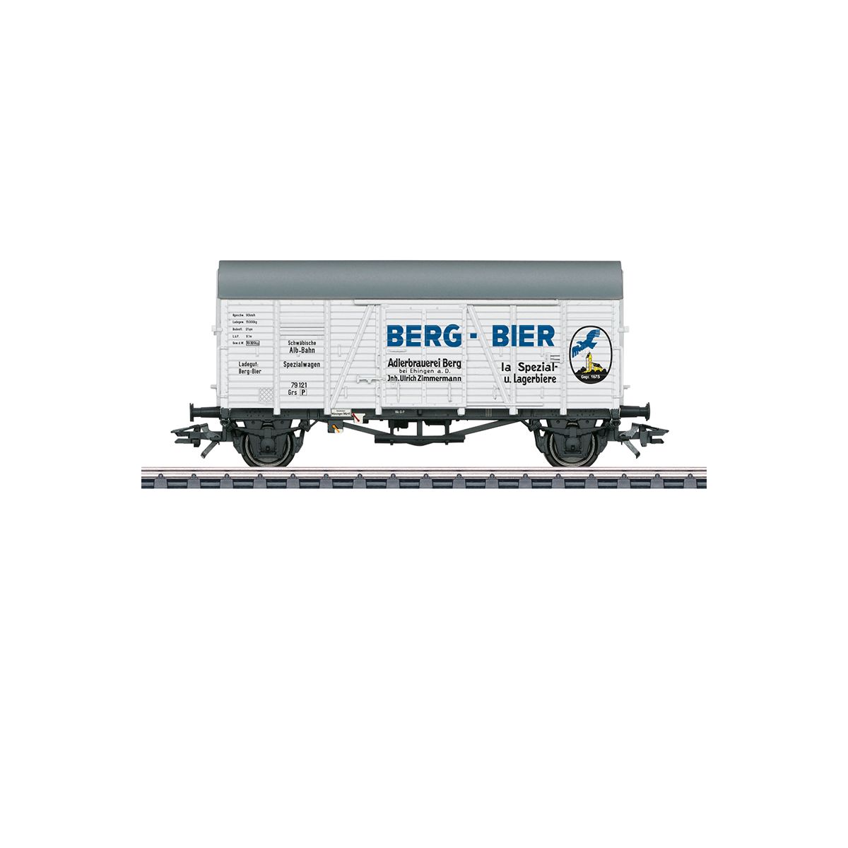 ''Oppeln'' | Spur H0 - Art.Nr. 94539 Güterwagen Berg-Bier, Ep.VI Vorbild: Güterwagen in Schweißtechnik der Austausch-Bauart ''Oppeln'', eingestellt bei der Schwäbische Alb-Bahn, Münsingen. Ausführung mit kurzem Fahrgestell ohne Bremserbühne. • Wiederauflage des beliebten Sammlermodells. • Wagen erstmals in kurzer Ausführung ohne Bremserbühne. • Stirnseiten gestaltet mit Werbelogo der aktuellen Epoche. Modell: Güterwagen in attraktiver Gestaltung der Berg Brauerei. Wagen in kurzer Ausführung ohne Bremserbühne, angelehnt an das Vorbild mit zusätzlicher Bedruckung der Stirnseiten. Länge über Puffer 10,4 cm. Gleichstromradsätze 2x 700580 separat erhältlich. Dieser Wagen erscheint 2023 als einmalige Serie und ist exklusiv in den VEDES MC-Fachgeschäften, bei der Schwäbische Alb-Bahn, Münsingen und der Berg Brauerei, Ehingen-Berg erhältlich. Spurweite: H0 Stromart: AC Epoche: VI LüP: 115mm Inklusive 2 Freibiermärkle für die Einkehr in der BrauereiWirtschaft der Berg Brauerei..