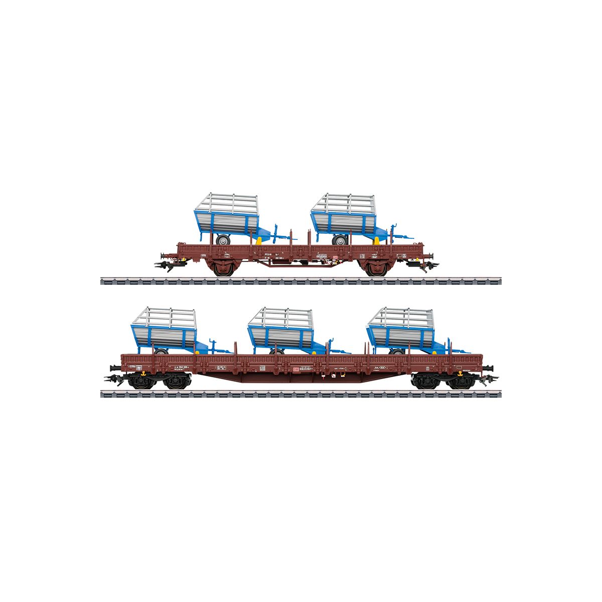 Vorbild: Zwei Rungenwagen unterschiedlicher Bauarten der Deutschen Bahn AG (DB AG). Beide Wagen mit Heuladewagen beladen. Betriebszustand ab 2007.