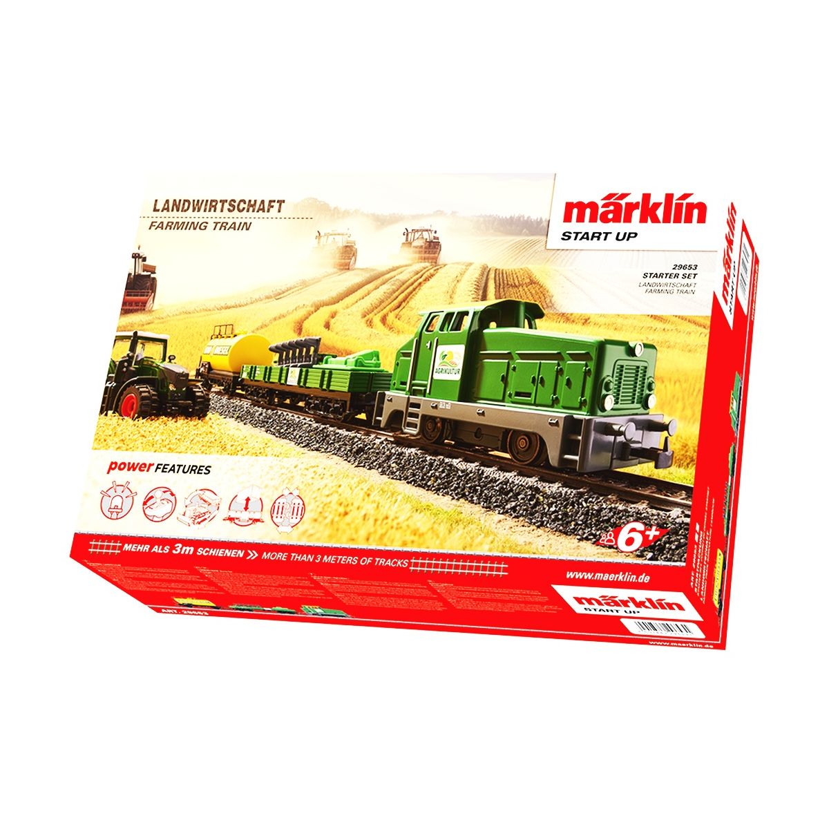 Erlebe die faszinierende Welt der Märklin Themenwelt Landwirtschaft.Raus auf die Felder heißt es heute und seit dem frühen Morgen sind die Landmaschinen bereits im Einsatz. Mit der starken Rangierlok werden weitere Maschinen keine Minute zu spät herangefahren.Das große Eisenbahn-Landwirtschafts-Set besteht aus einer Rangierlok und zwei unterschiedlichen Güterwagen. Für den totalen Spiel- und Bauspaß sorgen neben den verschiedenen Landmaschinen, auch die komplette Eisenbahnstrecke, inklusive Weiche und Abstellgleis.Ganz wie bei den Profis, steuerst du deine Rangierlok punktgenau mit dem coolen Märklin Power Control Stick. Mit seinem Geschwindigkeitsregler hast du die ganze Power in deiner Hand. Schalte punktgenau um von älangsam zurück“ auf äVollgas voraus“ – so wie du willst.