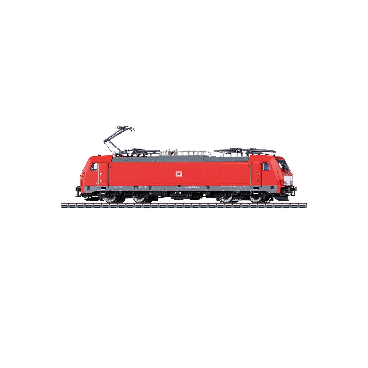 Vorbild: Elektrolokomotive Baureihe 186 der Deutschen Bahn AG. Verkehrsrote Grundfarbgebung. Betriebsnummer 186 339-8. Betriebszustand ab 2019.