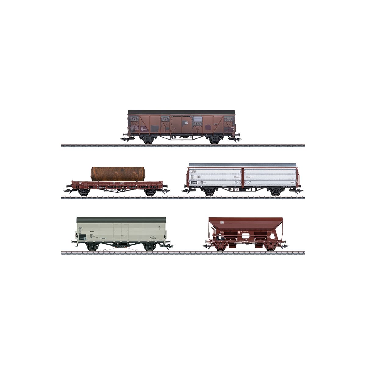 Vorbild: 5 zweiachsige Güterwagen unterschiedlicher Bauarten der Deutschen Bundesbahn (DB). 1 gedeckter Güterwagen mit Stirnwandtüren und Plattenwänden Bauart Hbcs 300. 1 offener Güterwagen mit Borden Bauart Klms 440, mit Beladung. 1 Schiebewandwagen Bauart Hbis 299. 1 offener Selbstentladewagen Bauart Ed 090. 1 Kühlwagen Bauart Ibdlps 383 mit waagerechten Brettern. Betriebszustand Mitte/Ende der 1970er Jahre.