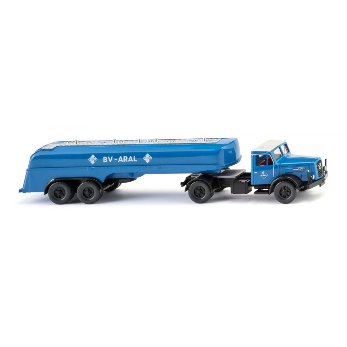 Was ein imposanter Auftritt für den Henschel! Der mächtige Hauber zieht den zweiachsigen Aral-Tankauflieger und erinnerte an die beginnenden Boomjahre der Kraftstoffversorgung in der Bundesrepublik. WIKING miniaturisiert nach dem Henschel-Frontlenker einen weiteren großen Klassiker der Tankwagen-Geschichte. Schon in den Fünfzigerjahren bemühte sich Aral in den verschiedenen Verkaufsniederlassungen um eine wachsende Logistik. Leistungsfähige Tankwagen waren gefordert, die die Treibstoffversorgung des immer größer werdenden Tankstellennetzes sicherstellten, zugleich aber in der Lage waren, mit größtmöglicher Ladekapazität Industriekunden zu beliefern. Mit diesem Henschel schickten die Lkw-Bauer aus Kassel damit auch ihr erstes PS-starkes Nachkriegszugpferd auf deutsche Straßen..