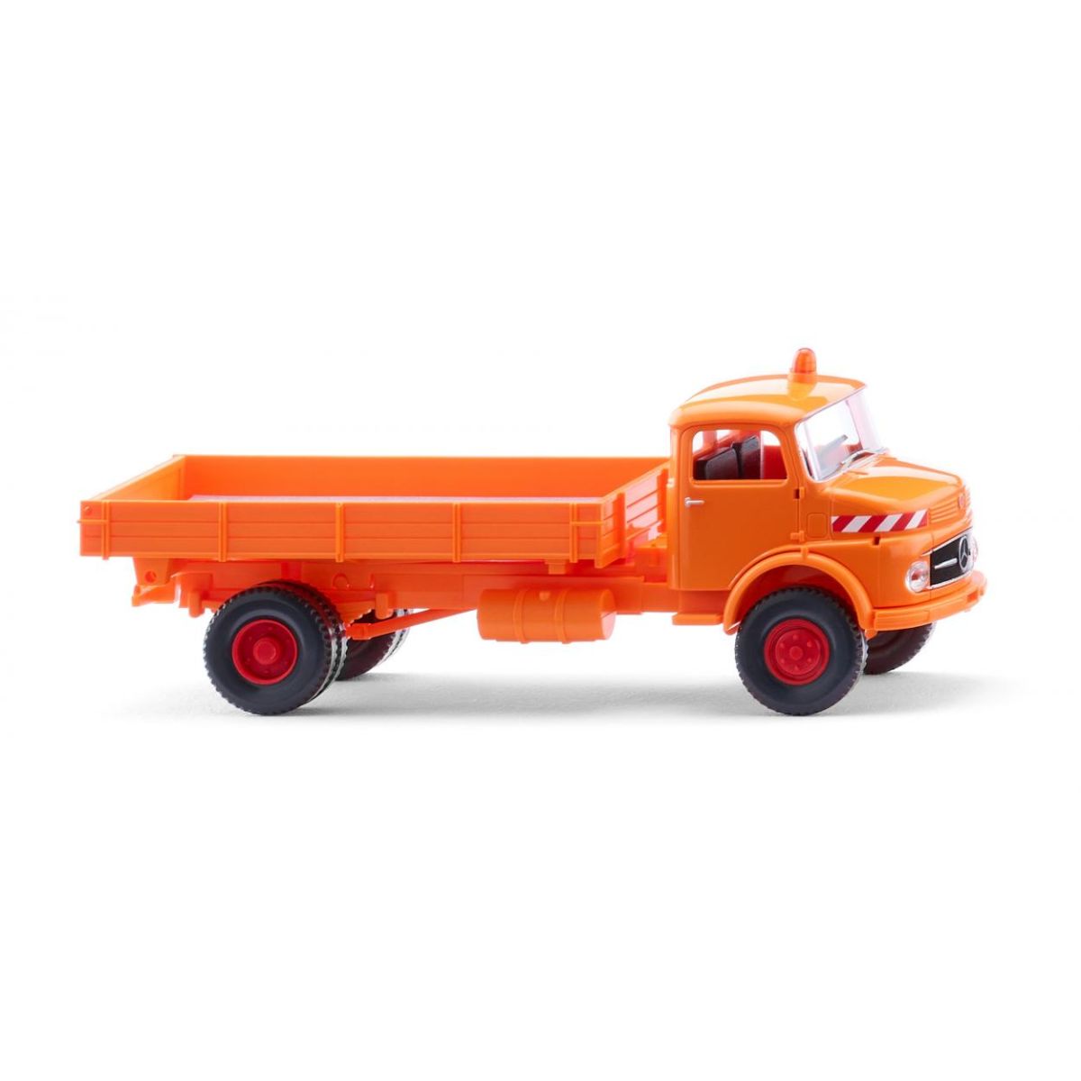 Die Straßenwärter der Sechzigerjahre wussten, dass auf ihn bei Wind und Wetter Verlass war. Dieser Mercedes-Benz LAK 710 Pritschenkipper spiegelt in 1:87 die einstige Wirklichkeit in den Bauhöfen von Städten und Straßenbauämtern wider. Die Verantwortlichen wünschten von ihren Einsatzfahrzeugen ein Höchstmaß an Flexibilität. Auf der Basis eines wendigen Lkw sollte die Pritsche kippbar und überall leicht beladbar sein. WIKING miniaturisiert den traditionsreichen Kurzhauber von Mercedes-Benz mit zahlreichen Details und versorgt ihn überdies mit dem gefälligen Zierrat, die die Mercedes-Benz-Hauber in jenen Jahren so charakteristisch machten. Hinzu kommt, dass der aufstellbare Kipper den Kurzhauber zu einem echten Baustellenklassiker macht. So kannte man den kompakten und ebenso wendigen Kipper in den kommunalen Bauhöfen und Straßenmeistereien. Natürlich sind die Frontscheinwerfer transparent eingesetzt. Bei Mercedes-Benz in Mannheim waren damals die 7,5-Tonner und 14-Tonner für den Verteilerverkehr und den Baustelleneinsatz vom Band gelaufen..