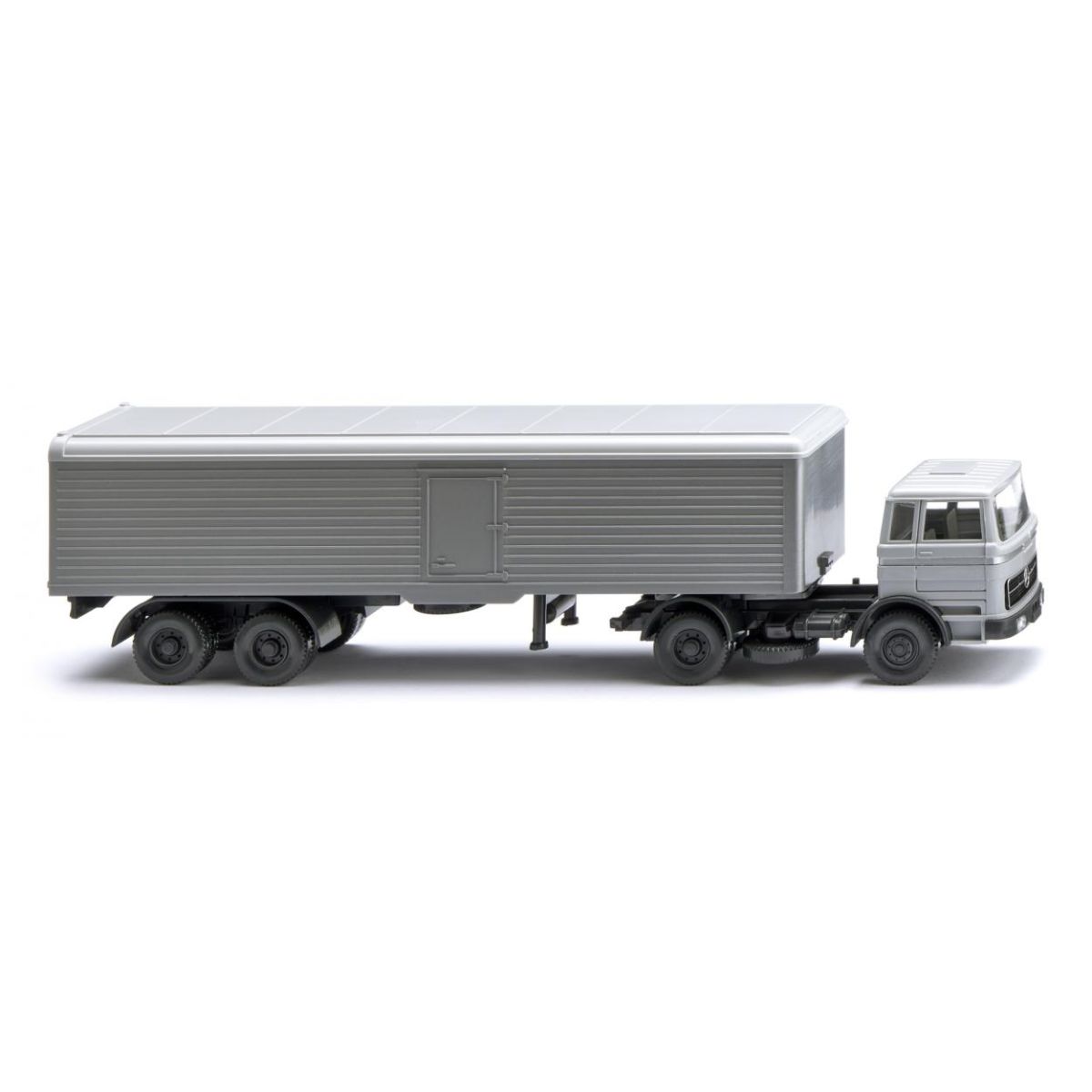 Der silbergraue Auftritt mit den horizontalen Streifenrippen am Kofferaufbau zeugen vom typischen Karosseriebau „made in USA. Und dazu gesellt sich die 1963 noch junge Generation der kubischen Baureihe des Mercedes-Benz 1620 – ein authentisches Gespann. Historisches Konstruktionsmaterial vom Dorsay-Auflieger hatte WIKING-Chef Fritz Peltzer höchstselbst im Archiv hinterlegt. Dazu passen jene Fotografien, die den Kofferauflieger bei der Europa-Präsentation auf der IAA 1963 zeigen. Modellbaumeister Alfred Kedzierski hatte daraus den damals innovativ neuen Kofferauflieger mit zwei Achsen gebaut. Mit dem Mercedes-Benz 1620 ist ein zeitgenössischer Koffersattelzug entstanden, der gerade wegen seiner zurückhaltenden Farbkombination ein hohes Maß an zeitgenössischer Authentizität mitbringt.The silver grey design with the horizontally striped ribs on the box superstructure attest to the singularity of Made in USA body construction. Forming an authentic pair, the trailer is now matched with the Mercedes-Benz 1620, representing a generation of cubic vehicles that was still young in 1963. It was WIKING head Fritz Peltzer himself who stored historical design material regarding the Dorsay semi-trailer in the archive. Going with these records are photographs that show the box semi-trailer during its European launch presentation at IAA 1963. These put master model maker Alfred Kedzierski in the position to manufacture the twin-axle box semi-trailer, which broke new ground at the time. The Mercedes-Benz 1620 is the embodiment of a contemporary semi-trailer box truck, delivering a high degree of contemporary authenticity precisely because of its restrained colour combination.