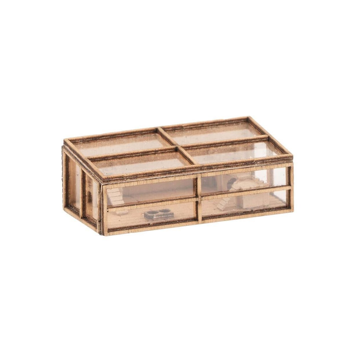 Spielgehege im Außenbereich. Lasercut-Modell eines Kleintierstalls aus Holz mit Überdachung und passender Innenausstattung für die Tiere, wie Rampen und Rückzugszonen..