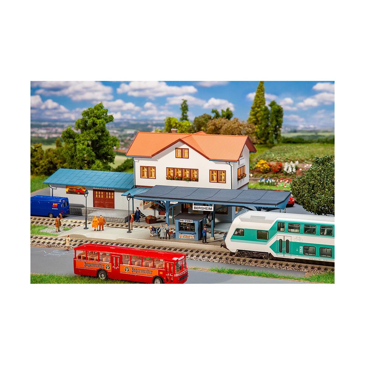 Überdachter Bahnsteig mit zahlreichem Ausschmückungszubehör, wie z. B. Kiosk, Sitzbänke, Infotafel, Abfallkörben und vieles mehr. Im Bausatzumfang ist eine Bahnsteigverlängerung mit Gleisabsenkung enthalten. Der Bahnsteig ist für alle Gleisarten geeignet und mit der LED-Lichtleiste, Art. 180654 beleuchtbar..