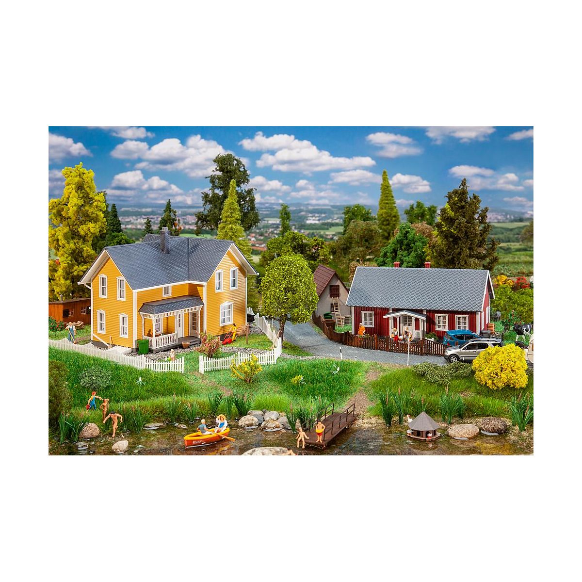 Schwedisch! Set bestehend aus einem einstöckigen Wohnhaus in roter Farbgebung mit Vordach, weißen Giebelfenstern und Schieferdach sowie einem zweistöckigen, gelben Wohnhaus mit mittigen Hausanbau. Der seitliche Hauseingang ist überdacht und auf der Rückseite des Gebäudes befindet sich eine typisch schwedische Eingangsveranda..