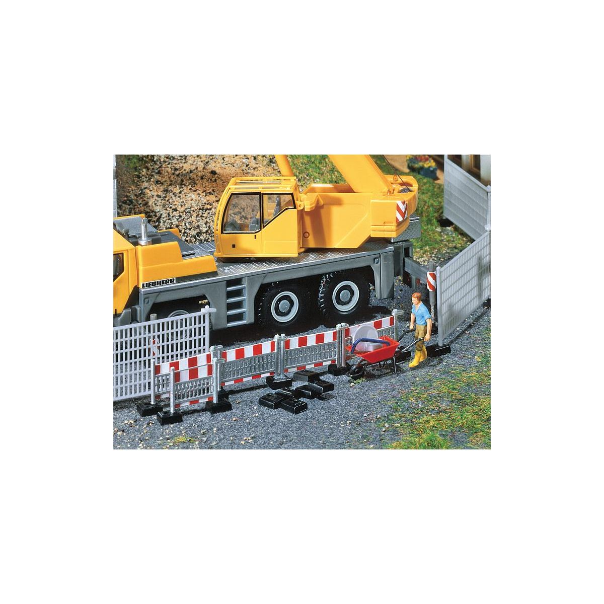 zum Teil bedruckt, mit Standfüßen, zum Absperren von Baugruben und Baustellen aller Art. Hoher Absperrzaun: Gesamtlänge 240 mm. Niederer Absperrzaun: Gesamtlänge 220 mm.