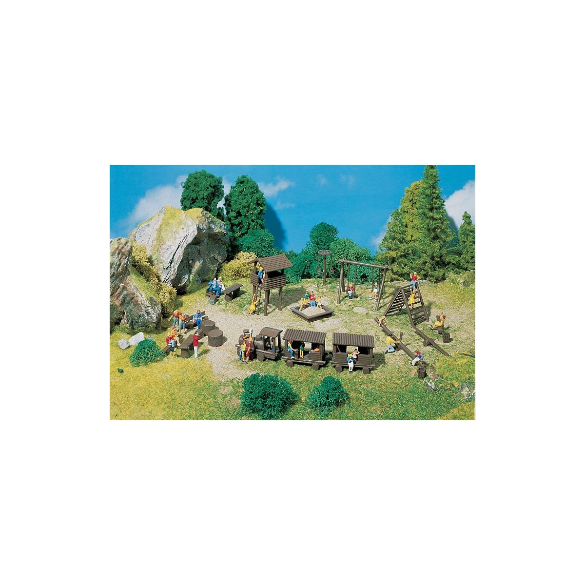 Abenteuerspielplatz mit Tischen und Bänken, Abfallkörben, Schaukeln, Wippen, Klettergerüst, Abenteuerhaus, Sandkasten, Rundlaufgerüst und einer Holzeisenbahn..