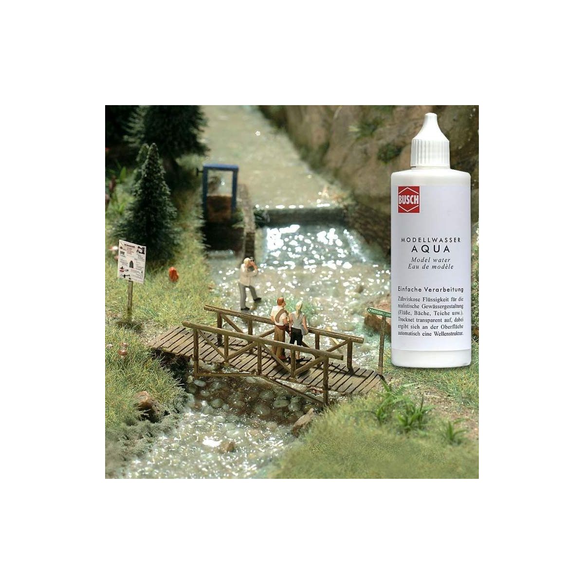 Zähviskose Flüssigkeit für eine einfache und realistische Gewässergestaltung (Bäche, Teiche usw.). Einfache Handhabung: Bachverlauf oder Teichuntergrund vorbereiten (farbig bemalen, evtl. mit Sand, kleinen Steinen und Gewächsen ausgestalten). Busch Aqua in den Bachverlauf, Teich usw. fließen lassen, so dass eine dünne Aqua-Schicht entsteht. Busch Aqua trocknet transparent auf, dabei ergibt sich an der Oberfläche automatisch eine Wellenstruktur. Bei tiefen Gewässern mehrere Schichten auftragen. Für Wasserfälle Busch Aqua auf eine transparente Folie fließen lassen, nach dem Trocknen ausschneiden und an die entsprechenden Stellen kleben. Mit flüssigem Busch Aqua die Übergangsstellen tarnen. Busch Aqua ist einfach in der Verarbeitung, ergibt eine sehr natürlich wirkende Wasseroberfläche, ist geruchsneutral, greift andere Materialien nicht an und bei der Verarbeitung entsteht keine Erwärmung. Inhalt: 125 ml..