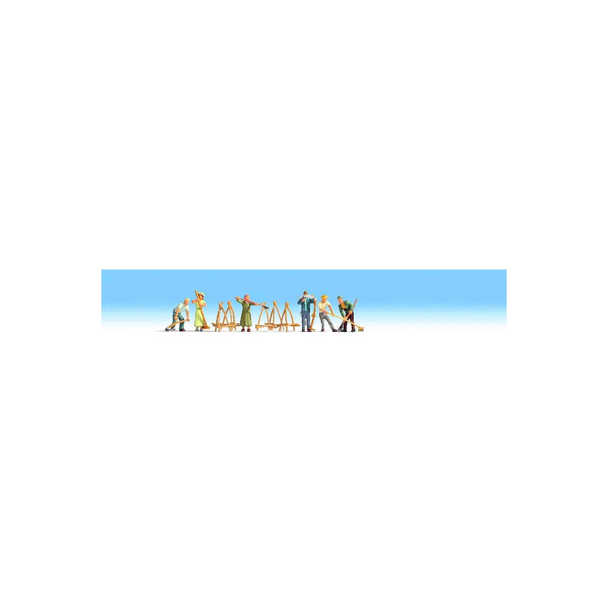 Landwirte bei der Heuernte.Das Set für die Spur H0 (Maßstab 1:87, ca. 2 cm hoch) enthält sechs Landwirte bei der Heuernte sowie fünf Heinzen und weitere Arbeitsgeräte.Ein Mann in einem hellen Shirt und einer blauen Hose beugt sich nach vorne, um das Gras mit einer Sichel zu mähen. Die junge Frau im gelben Kleid hält einen Rechen in der Hand. Eine weitere Bäuerin trägt ein grünes Kleid und schaufelt das Heu mit einer Gabel auf die Heinzen. Der Mann mit der blauen Jacke und dem hellblauen Hemd schleift seine Sense, damit diese wieder scharf ist. Ein weiterer Landwirt in einem hellgelben Hemd und einer grauen Hose recht das Heu zusammen. Der letzte Arbeiter trägt eine grüne Jacke, ein gelbes Hemd sowie eine braue Latzhose und lädt das Heu mit einer Gabel auf.Die Miniaturfiguren sind ideal zur Dekoration von ländlichen Szenen geeignet..