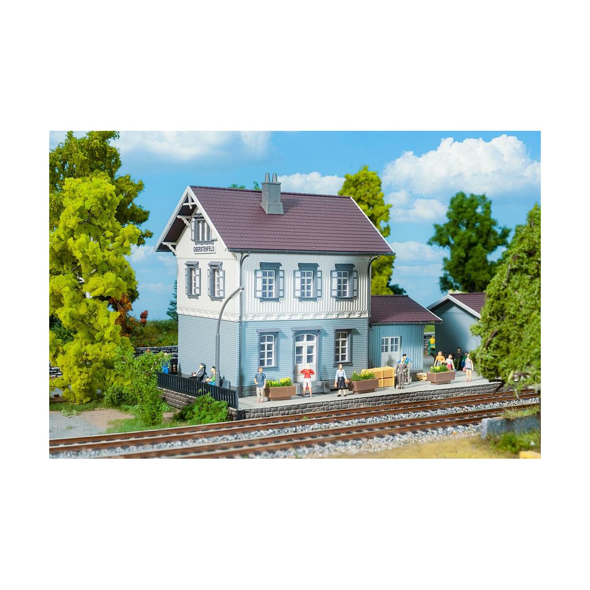 Langsam rollt der Zug ins Gleis, und die Fahrgäste auf dem Bahnsteig bereiten sich auf die Abfahrt vor. Der Bahnhof mit seiner hellblau-weißen Holzfassade, gestaltet nach dem Originalvorbild von Oberstenfeld, ist ein echter Blickfang auf der Modellanlage. Oberstenfeld liegt an der Bottwartalbahn zwischen Marbach und Heilbronn. Nach der Stilllegung der Bahn wurde der Bahnhof restauriert und dient heute als örtlicher Gemeindetreff. Er verkörpert den Charme eines typischen Kleinstadtbahnhofs, voller liebevoller Details, die ihm einen besonderen Charakter verleihen..