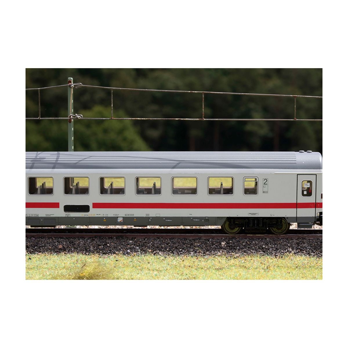 Modell: Serienmäßig eingebaute LED-Innenbeleuchtung und Strom führende Kupplungen. Die Innenbeleuchtung funktioniert im Verbund mit dem IC-Steuerwagen und kann über einen Decoder im Steuerwagen digital ein- und ausgeschaltet werden. Stirnseitig rot transparente Schlusslicht-Einsätze an den Wagenenden. Typspezifisch gestaltete Schürze. Mit Drehgestelle MD ohne Generator. Bauliche Merkmale druckertüchtigter Wagen wie beispielsweise SIG-Übergänge, Einstiegstüren und Fenster. Aufgedruckte Wagenlaufschilder. Befahrbarer Mindestradius 360 mm. Länge über Puffer ca. 28,2 cm.