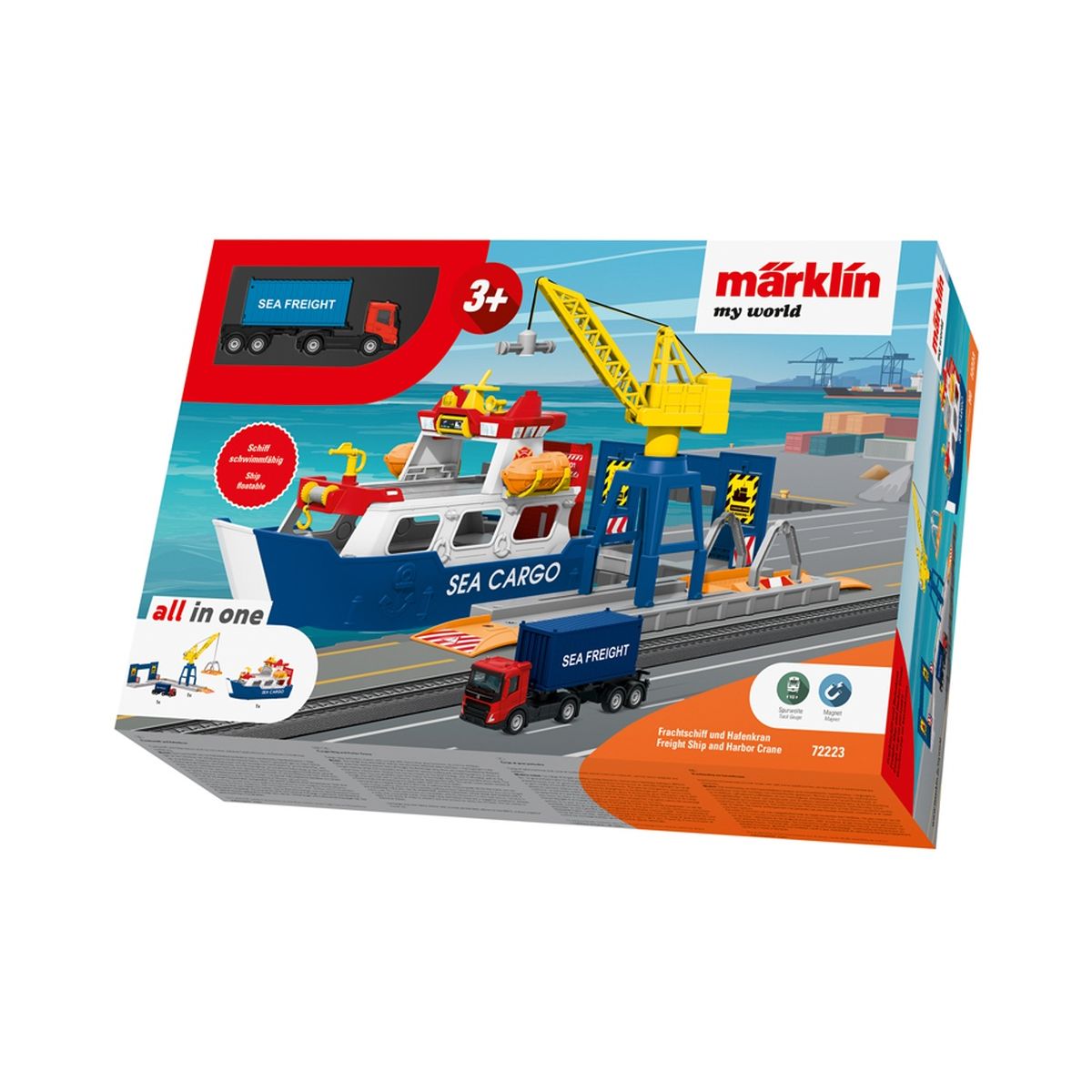 Das Frachtschiff und die Hafenstation mit dem Kran sind die ideale Ergänzung zur Startpackung Hafenlogistik 29342.
