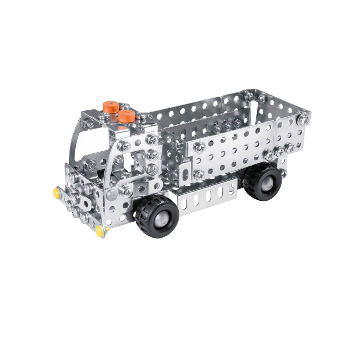 Für kleine Fans großer Baufahrzeuge: Der eitech LKW Kipper aus der „Kids Kollektion, ein authentischer Lastwagen für Hobby-Schrauber. Dank seiner Profilreifen und der Kippmulde zum Be- und Entladen bringt der Kipplaster auch nach dem Aufbau noch jede Menge Spielspaß mit und kann vielfältig im Kinderzimmer eingesetzt werden. Im Fahrerhaus ist Platz für Spielzeugfiguren mit einer Größe bis zu 4,5 cm (nicht mitgeliefert). Der Metallbaukasten C280 - LKW Kipper kann mit seinen 190 Teilen von Kindern ab 8 Jahren erbaut werden. Ganz nebenbei schult Ihr Kind spielerisch seine Feinmotorik und das räumliche Denken. Die Qualitätsprodukte von eitech® sind zu 100 % im thüringischen Pfaffschwende produziert und frei von jeglichen Schadstoffen. Benötigtes Montagewerkzeug und eine bebilderte Schritt-für-Schritt-Bauanleitung sind im Lieferumfang enthalten..
