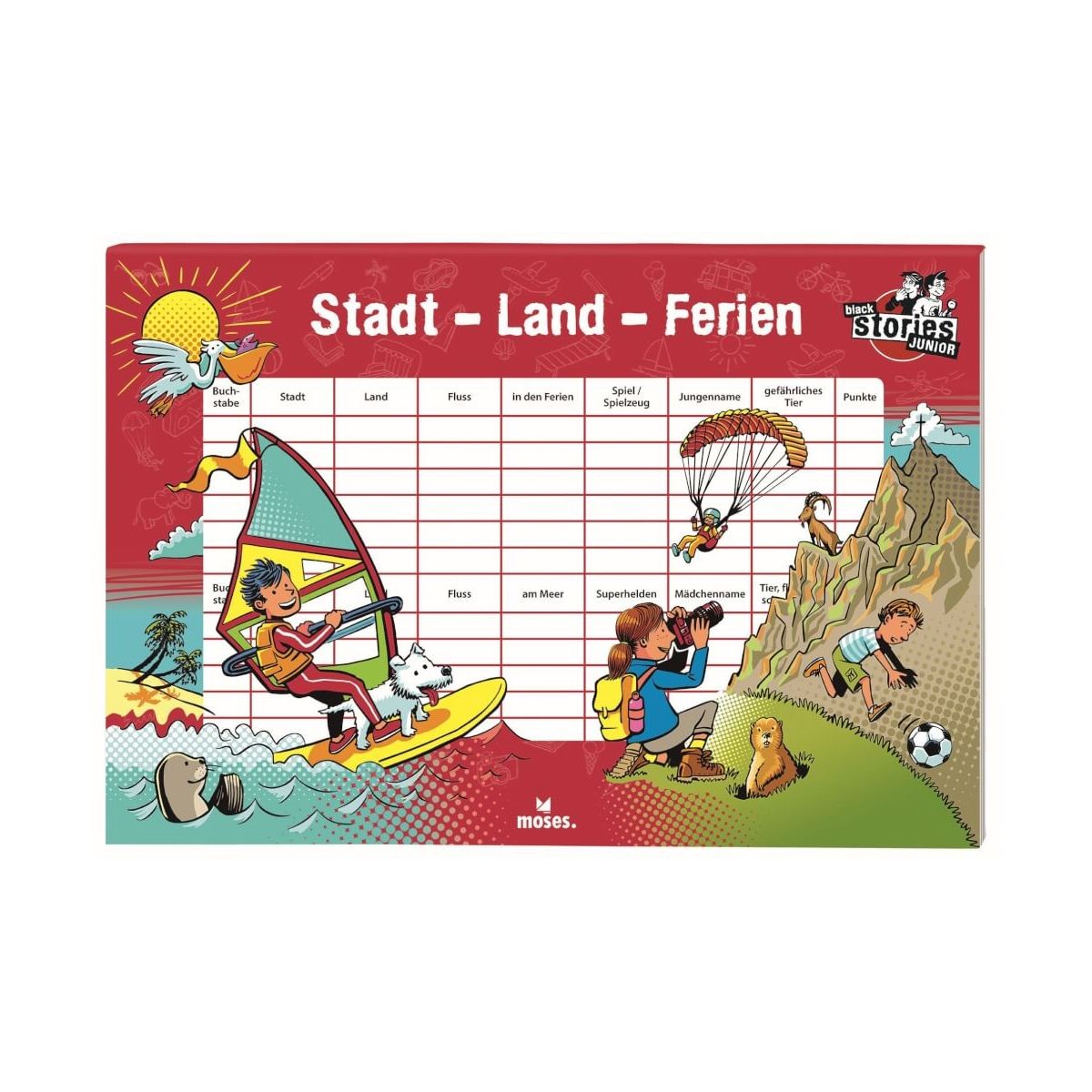 Stadt-Land-Fluss war gestern – Jetzt gibt es den Kinderbeschäftigungs-Klassiker endlich als „Stadt-Land-Ferien bei black stories Junior! Wenn die Zugfahrt in den Urlaub mal wieder zu lange dauert, wenn die Wartezeit im Stau der Familie den letzten Nerv raubt, dann ist es Zeit für eine Runde „Stadt-Land-Ferien. In dieser abwechslungsreichen Variante des Klassikers Stadt-Land-Fluss wimmelt es vor Suchbegriffen, die es richtig in sich haben, und bei denen eure Kreativität und euer Einfallsreichtum gefragt sind. Das Spiel ist der perfekte Zeitvertreib für alle, denen das normale Stadt, Land, Fluss viel zu langweilig ist. „Stadt-Land-Ferien sorgt natürlich auch für Spielspaß, wenn gerade kein Urlaub ansteht. So wird’s gespielt: Vor jeder Runde wird ein Buchstabe ermittelt, indem ein Mitspieler laut „A sagt und dann im Stillen das Alphabet weiter durchgeht, bis ein anderer Mitspieler „Stopp! ruft. Mit dem Buchstaben, bei dem der erste Spieler gerade angelangt ist, müssen alle Begriffe aus dieser Runde beginnen. Nun versuchen die Spieler, so schnell wie möglich die einzelnen Felder einer Reihe auszufüllen. Wer zuerst alle Begriffe für diese Reihe gefunden hat, ruft „Stopp!. Danach werden die Punkt für diese Reihe ausgewertet. Der Spieler, der am Schluss die meisten Punkte hat, gewinnt. Illustrationen: Helmut Kollars Design: Kirsten Küsters Inhalt + 50 Blatt + 2 verschieden gestaltete Innenseiten + 19 unterschiedliche Suchbegriffe - Lieferung nur nach Deutschland und Österreich -.