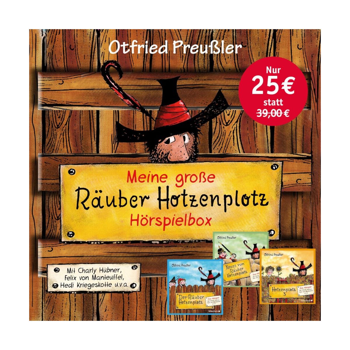 Vorsicht, Hörspielgold! Diese Gesamtausgabe zum Sonderpreis vereint alle drei Hörspiele um den Räuber Hotzenplotz: »Der Räuber Hotzenplotz«: Kasperl und Seppel machen sich auf, den wilden Räuber zu fangen, der Großmutters Kaffeemühle gestohlen hat. Dummerweise landen sie dabei in Hotzenplotz’ Falle … »Neues vom Räuber Hotzenplotz«: Dimpfelmosers gefährlichster Gefangener ist aus dem Spritzenhaus entflohen. Zu allem Unglück hat Hotzenplotz auch noch Großmutter entführt und fordert jetzt Lösegeld. »Der Räuber Hotzenplotz - Schluss mit der Räuberei «: Genug geräubert! Hotzenplotz will seinen Job an den Nagel hängen. Doch von was soll er jetzt leben? Vielleicht muss er nach Amerika auswandern und dort nach Gold suchen? Oder soll er doch besser ein Wirtshaus eröffnen? Mit Pauken und Trompeten inszeniert - mit Charly Hübner als Räuber Hotzenplotz, Jens Wawrczeck als Petrosilius Zwackelmann, Hedi Kriegeskotte als Großmutter, Felix von Manteuffel als Erzähler u.v.a..
