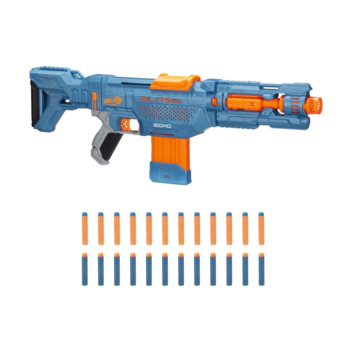 Mit Nerf Elite 2.0 Blastern erreicht das Battle ein neues Level, denn sie verfügen über eingebaute Erweiterungsmöglichkeiten, um sie upzugraden und im Nerf Battle den entscheidenden Vorteil zu haben. Mit einem Vorrat an Elite 2.0 Blastern kann die eigene Spielstrategie optimiert und jede Mission taktisch klug und flexibel gestaltet werden. Der Nerf Elite 2.0 Echo CS-10 Blaster enthält eine abnehmbare Schulterstütze und eine abnehmbare Laufverlängerung zum Anpassen des Blasters. Die 4 Tactical Rail Steckschienen können genutzt werden, um andere Accessoires hinzuzufügen (nicht enthalten). Der Blaster verfügt über ein 10-Dart Clip-Magazin. Es kann 1 Dart nach dem anderen abgefeuert werden oder es können alle 10 Darts in schneller Folge mit dem Pump-Action Schnellfeuer-Blaster abgeschossen werden. Kommt mit 24 Nerf Darts das Clip-Magazin bietet Platz für 10 und der Rest kann in der Nähe zum Nachladen aufbewahrt werden. Feuert die Darts bis zu 27 Meter weit. Keine Batterien erforderlich. Das Tragen eines Augenschutzes wird empfohlen (nicht enthalten). Nerf and all related properties are trademarks of Hasbro..