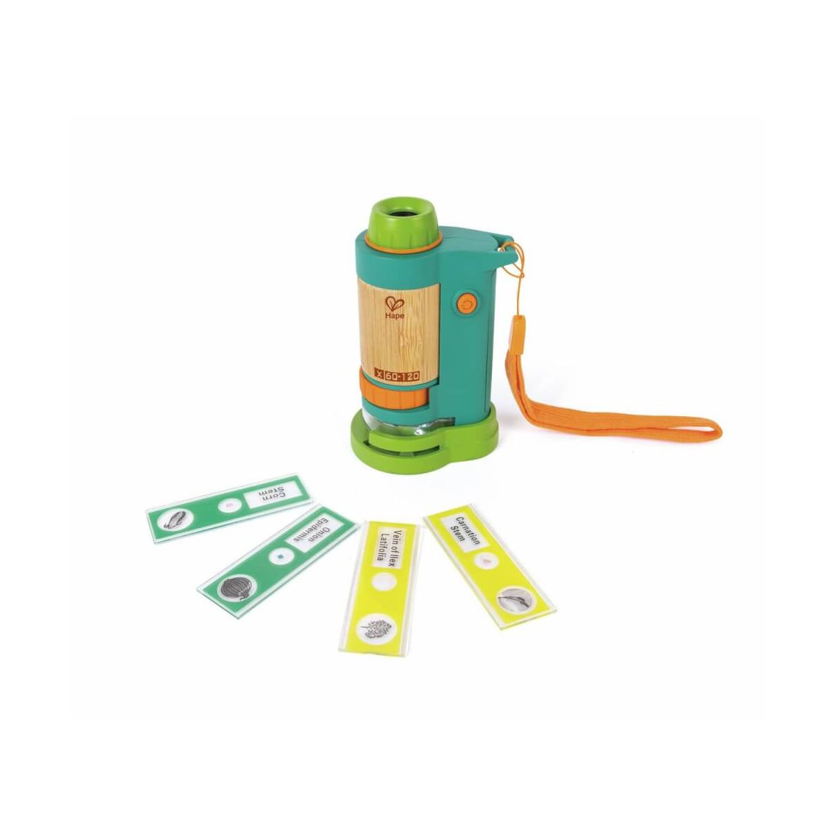 Ideales Lernspielzeug und treuer Begleiter von kleinen Entdeckern! Das tolle Bambus-Mikroskop passt perfekt in kleine Hände, die es prima auf ihrer Entdeckertour mitnehmen und festhalten können. Das farbenfrohe grüne Gehäuse ist aus umweltfreundlichem PE-Kunststoff gefertigt, damit die Kleinen mit einem nachhaltigen Werkzeug die Welt erkunden können. Mit dem Mikroskop können die Kinder Objekte mit 60-, 100- und 120-facher Vergrößerung betrachten. So bleibt ihnen nichts mehr verborgen und sie können die Wunder der Natur erforschen. Das Mikroskop ist kindgerecht gestaltet, kann überallhin mitgenommen werden und ist einfach im Aufbau und in Funktionalität..