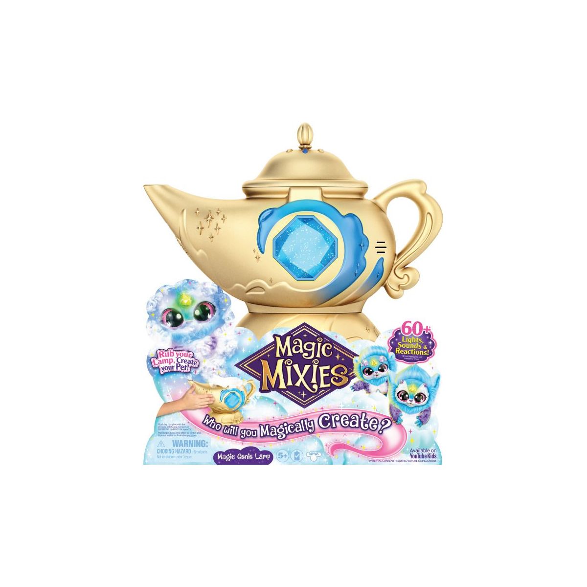 Die neue Wunderlampe von Magic Mixies sorgt für ganz neue magische Momente. In dieser geheimnisvollen goldenen Wunderlampe steckt ein Flaschengeist-Mixie, das nur darauf wartet, enthüllt zu werden! Höchste Zeit, die magischen Schritte durchzuführen und echte Magie zu vollbringen – die magische Wunderlampe hat vielseitige Funktionen wie Nebelzauber, 60 verschiedene Lichteffekte, Geräusche und Reaktionen! ,Beschwöre zuerst deinen Mixie und enthülle den Zauberring, der im Inneren verborgen ist. Wenn du an der Lampe reibst, strömt echter magischer Nebel aus dem Schnabel und der Kristall leuchtet auf! Das interaktive Flaschengeist-Mixie sorgt für stundenlangen Spielspaß, wenn du die Geheimnisse der Lampe entdeckst und enthüllst. Wenn alle Zauberschritte erfüllt sind, steigt dein Mixie auf magische Weise aus der Lampe empor! Nimm dein niedliches interaktives Flaschengeist-Plüschtier heraus! Der magische Spielspaß hat gerade erst begonnen. Sobald du das Mixie aus der Lampe genommen hast, kannst du den Zauberring verwenden, um mit deinem Mixie zu spielen. Gib deinem neuen magischen Freund einen Namen und schon schaltest du die drei verschiedenen Modi frei – Wunschmodus, Spielmodus und Sprechmodus. Mit dem aufleuchtenden Kristall auf seiner Stirn kann dein Mixie Wünsche erfüllen oder verwehren und vieles mehr! Wen wirst du aus der magischen Magic Mixies Wunderlampe herbeizaubern? ,,.