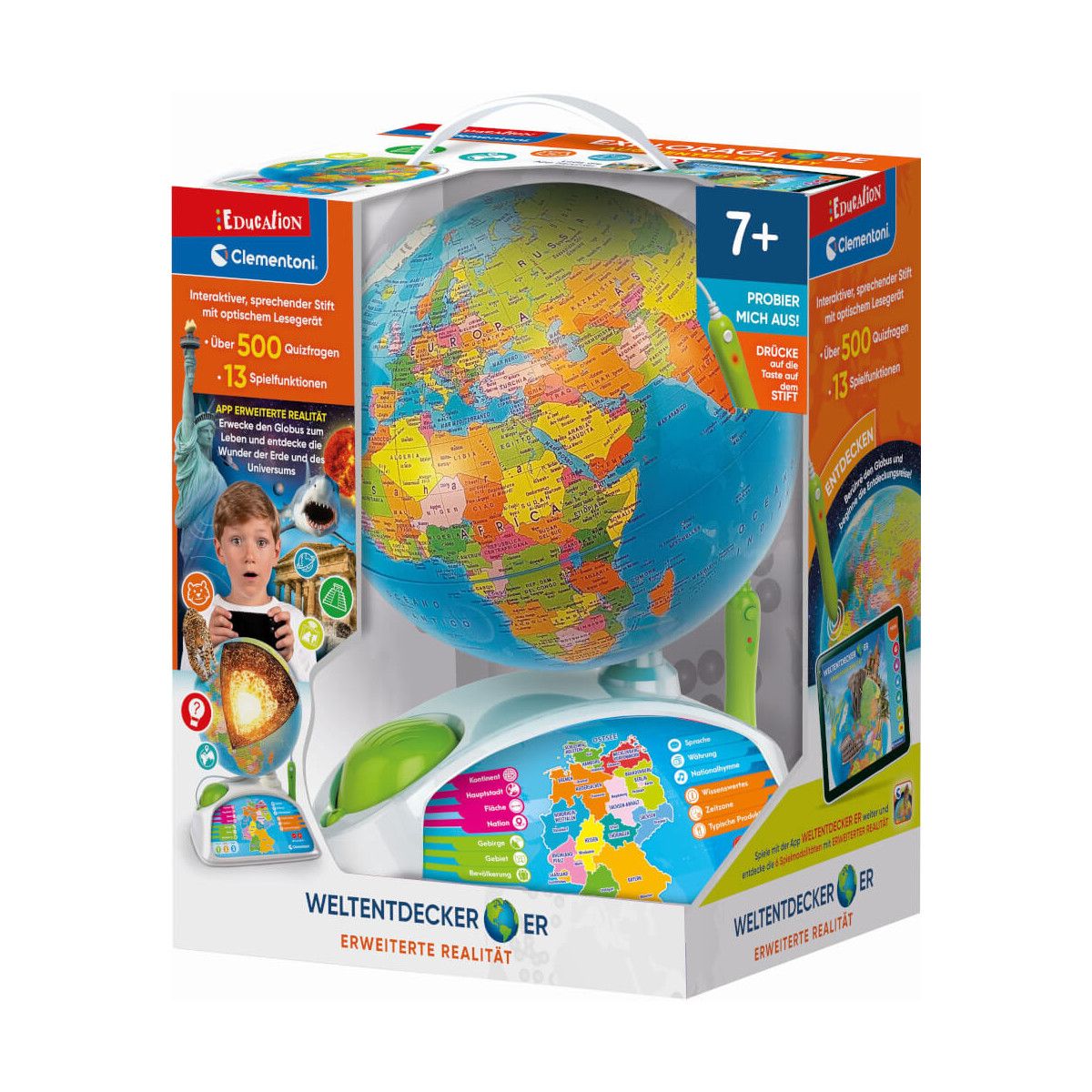 Ein interaktiver Globus, um die Schätze der Welt zu entdecken und lustige Rätsel zu lösen. Um sich auf eine Reise des Wissens zu begeben, muss das Kind den optischen Stift auf den Globus richten, um alles über den ausgewählten Ort herauszufinden. Über 500 Fragen in drei Schwierigkeitsgraden, um die erworbenen Kenntnisse zu überprüfen und Freunde und Eltern herauszufordern. Jede Menge Informationen und 13 Spielmodi für stundenlangen Spielspaß! Kontinente, Nationen, Hauptstädte, Fläche, Bevölkerung, Währung, Sprache, Territorium, Berge, Zeitzonen, interessante Fakten, lokale Produkte, Nationalhymnen, Klima, Geschichte, Regierung. Mit der App geht das Spiel weiter! Du kannst mit der Augmented Reality spielen, indem du den Globus einrahmst und ihn zum Leben erweckst! Die App ist mit Android und Apple kompatibel. Dank der neuen App mit erweiterter Realität wird der Globus zum Leben erweckt! Neben interaktiven Quizspielen können die Kinder auch Wahrzeichen, Denkmäler und animierte Tiere auf dem Globus betrachten.
